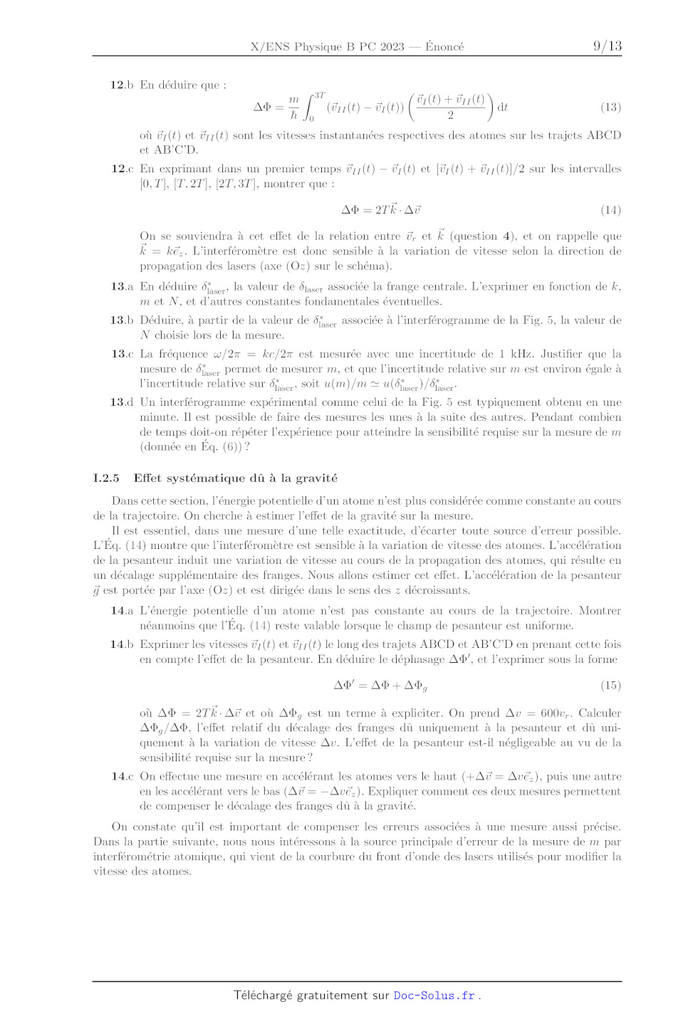 régions Où -- > 0 et où -- < 0. Ox? Ox? 20.b En utilisant l'Éq. 21, en déduire le signe 0k,4 dans les régions associées aux maxima et aux minima d'intensité, et vérifier que l'on retrouve bien les résultats donnés à la question 19. Commenter ce résultat au regard du signe de la correction de Gouy trouvée précédemment (question 18.c), qui est la correction obtenue au foyer optique d'un faisceau gaussien, où l'intensité est maximale. Le signe de la correction Ôk,4 dépend des fluctuations de l'intensité. On note (0k,a) la correction moyenne, où la moyenne est effectuée selon x sur une échelle spatiale de l'ordre de la taille du nuage atomique étudié (+ 1 mm). On pourrait a priori s'attendre à ce que (0k,4) soit nul, c'est-à-dire que l'effet dû aux régions où (0kre) est positif soit en moyenne compensé par celui où (ôk,4) est négatif. Ce n'est en réalité pas le cas. En effet, dans l'expérience de mesure de m, la probabilité d'absorption d'un photon par un atome dépend de l'intensité : il est d'autant plus probable pour un atome d'absorber un photon (et donc de subir une variation de quantité de mouvement p, selon (Oz)) que l'intensité est élevée. 21. En déduire le signe de la correction moyenne (ôk,4) associée aux fluctuations d'intensité. Un tel effet doit être estimé afin de corriger la valeur de m mesurée. Ceci est permis par des mesures précises du profil d'intensité des faisceaux lasers utilisés. 22. Si expérimentalement on chassait tous les atomes situés dans les maxima d'intensité du faisceau, l'impulsion des photons p ne serait alors transférée qu'aux atomes situés dans les minima d'intensité. Comparer (p,), la variation moyenne de quantité de mouvement d'un atome selon l'axe (Oz) due à l'absorption d'un photon, à la valeur attendue dans le cas où le faisceau laser serait une onde plane de vecteur d'onde k# = kë,. Est-ce surprenant ? sé Phase 1.26 9 0,045 _ 1.20 oe 51 0.030 1.14 © - 10.015 1.08} f_ 52 1.02t 6 10.000 N 0.96 " --0,015 0.90 0.84 54} --0.030 0.78 D --0.045 -300 -200 -100 O 100 200 -300 -200 -100 © 100 200 x (um) x (um) FIGURE 6 -- Simulation de la propagation d'un faisceau laser présentant initialement un profil d'in- tensité hétérogène selon l'axe (Ox) sur des échelles spatiales de l'ordre de 100 pm. Le faisceau se propage selon l'axe (Oz) dans le sens des z croissants. À gauche : profil d'intensité Z(x,z)/10 (où Lo est l'intensité moyenne du faisceau). L'échelle de couleurs située à gauche de l'image indique la valeur de I(x,z)/10 (valeur sans unité). À droite : évolution de la phase d' du champ électrique associé. L'échelle de couleurs située à droite de l'image indique la valeur de &' en rad. - Fin des questions - 11 Pour aller plus loin : Le Modèle standard est actuellement la théorie la plus aboutie pour décrire les particules élémentaires et trois des quatre interactions fondamentales de l'univers (interactions électromagnétique, forte et faible). En revanche, ce modèle n'inclut pas l'interaction gravitationnelle et ne permet ni de com- prendre la "matière noire", ni l'"énergie sombre", ni les différences de proportion observées dans l'Univers entre matière et anti-matière. Les mesures extrêmement précises de certaines constantes fondamentales imposent des contraintes fortes sur les nouvelles théories candidates, et permettent d'écarter celles dont les prévisions sont incompatibles avec les résultats de la mesure. Comme indiqué au début du sujet, la mesure la plus précise de a a été effectuée par interférométrie atomique, et repose sur la mesure de la masse de l'atome de Rubidium 87. La valeur de 1/a reportée en Égq. (3) est déterminée à partir d'une autre mesure : la valeur du "moment magnétique anomal" de l'électron |, grandeur sans dimension notée a.. Cette grandeur peut être reliée théoriquement à « par des calculs effectués dans le cadre du Modèle Standard : Ge = > Cia + e.0 (22)