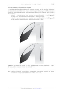 -< Ne pas utiliser de correcteur. -_ Écrire le mot FIN à la fin de votre composition. Les calculatrices sont interdites. Le sujet est composé de quatre parties. L'épreuve est à traiter en langage Python. La syntaxe de Python est rappelée en Annexe en fin de sujet. Les différents algorithmes doivent être rendus dans leur forme définitive sur le Document Réponse dans l'espace réservé à cet effet en respectant les éléments de syntaxe du langage (les brouillons ne sont pas acceptés). La réponse ne doit pas se limiter à la rédaction de l'algorithme sans explication, les pro- grammes doivent être expliqués et commentés. Énoncé : 16 pages Document Réponse et Annexe : 10 pages Seul le Document Réponse doit être rendu dans son intégralité. 1/16 Assemblage et déformation de pièces automobiles Introduction L'objectif de cette étude est la modélisation du comportement géométrique de pièces défor- mables par la méthode des éléments finis. La partie | déterminera le posage des pièces et sera illustrée par un modèle 2 dimensions. La partie Il permettra d'établir le maillage d'une surface plane pour pouvoir appliquer dans la partie III la méthode de résolution par éléments finis. La partie IV présentera la synthèse de l'étude et une application sur le cas d'une por- tière et de la caisse d'un véhicule. Dans tout le sujet, il sera supposé que les modules python numpy, matplotlib.pyplot sont déjà importés dans le programme. Les fonctions et méthodes autorisées sont indiquées dans l'annexe à la fin du Document Réponse. De manière générale, l'utilisation des méthodes autres que les méthodes append et remove ne sera pas acceptée. L'utilisation des fonctions min OÙ max Sera proscrite. Partie | - Posage des pièces 1.1 - Présentation Le posage consiste à mettre deux pièces en contact. Les pièces n'étant jamais parfaites, le nombre des points en contact n'est jamais infini comme cela pourrait être le cas lorsque l'on pose 2 surfaces parfaitement planes l'une sur l'autre. Ces points de contacts ponctuels doivent être identifiés car ils peuvent être à l'origine de variations géométriques et d'efforts particuliers. Contact parfait Contact réel Figure 1 - Illustration du problème de posage sur des surfaces réelles Pour illustrer la question du posage, on travaille en 2 dimensions et on se limite au posage d'une pièce sur une autre. Les géométries ont été discrétisées en un nombre fini de points. Un prétraitement, qui ne sera pas abordé ici, permet d'extraire les coordonnées des points concernés par le posage. En 2 dimensions, pour chaque point d'abscisse x, = k Ax, est asso- ciée son altitude z, où Ax correspond à une longueur élémentaire associée à la discrétisation spatiale. Ces données sont stockées dans une liste P de N nombres dont l'indice k des élé- ments permet de définir l'abscisse des points et les valeurs leur altitude. Ainsi, x; = k Ax et zx = P[k] où 0 < k < N. La variable Delta_x sera associée à la longueur élémentaire Ax et sera supposée déjà définie. Il sera inutile de la passer en argument des différentes fonctions. 2116 Z Pièce 1 Z Pièce 2 © N Co : 4 LR ai N Figure 2 - Exemple de géométries discrètes associées à des pièces en 2D Par exemple, sur la figure 2, on associe à la pièce de gauche la liste P1 =[2.,3.,2.,3.]. Q1. Donner la liste P2 associée à la pièce 2 sur la figure 2. Pour répondre au problème du posage, il faut commencer par retourner la pièce en effec- tuant une rotation autour de l'axe (O, ÿ), pour que les points soient bien en vis-à-vis. Q2. Écrire une fonction retourne(Ls) qui prend une liste Ls de nombres en argument et qui renvoie une nouvelle liste dont l'ordre des éléments est inversé et le signe de chaque élément lui aussi inversé. Par exemple, retourne([1.,2.,3.]) renverra [---3.,-2.,-1.]. |? Figure 3 - Exemple de posages entre 2 pièces. À gauche : posage aux points 1 et 3. À droite : posage aux points 1 et 2 avec collision en 3 On appellera posage optimal, le posage qui vérifie les deux contraintes suivantes : °< le minimum des distances algébriques entre les points en vis-à-vis doit être positif pour valider le fait qu'il n'y ait pas de collision, °< le maximum des distances entre les points en vis-à-vis doit être le plus petit possible. Q3. À partir des deux pièces de la figure 3, représenter la pièce 2 associée au posage (contact) aux points 0 et 1, puis la pièce 2 associée au posage aux points 2 et 3. Indiquer dans chaque cas si le posage génère des collisions ou non. Pour caractériser le posage, la méthode mise en oeuvre consiste à repérer la position des points du maillage de la deuxième pièce par rapport à ceux de la première pièce. On se placera dans le cadre d'une pièce faiblement inclinée (sur la figure 4, l'inclinaison est am- plifiée). Pour chacune des deux pièces, on associe une droite passant par les 2 points de contacts. Les deux droites ainsi définies seront coïncidentes lors du contact entre les deux pièces comme l'illustre la figure 4. 3/16 Pièce 2 droites coïncidentes Figure 4 - Exemple de posage associé à deux autres pièces Pièce 1 On considère le posage sur les points n et p. On note 7,, et z,, les altitudes des points de contact sur la pièce référence, et z,, et z,, les altitudes des points de contact sur la pièce à poser. L'équation d'une droite qui passe par deux points de contact ayant pour coordonnées (nAx, z,) et (pAx, z,) est : z=ax+b (1) avec pour coefficient directeur a et pour ordonnée à l'origine b tels que : Zn -- Zp (Zn -- Zp) TP et b=z,- "T7. (a=p}Ax np Q4. Écrire la fonction droite(Ls,n,p) qui prend en arguments la liste des altitudes Ls et deux entiers n et p correspondant aux indices des deux points de contact et qui renvoie une liste contenant la pente a et l'ordonnée à l'origine 2 de la droite associée. On applique cette fonction au bâti 