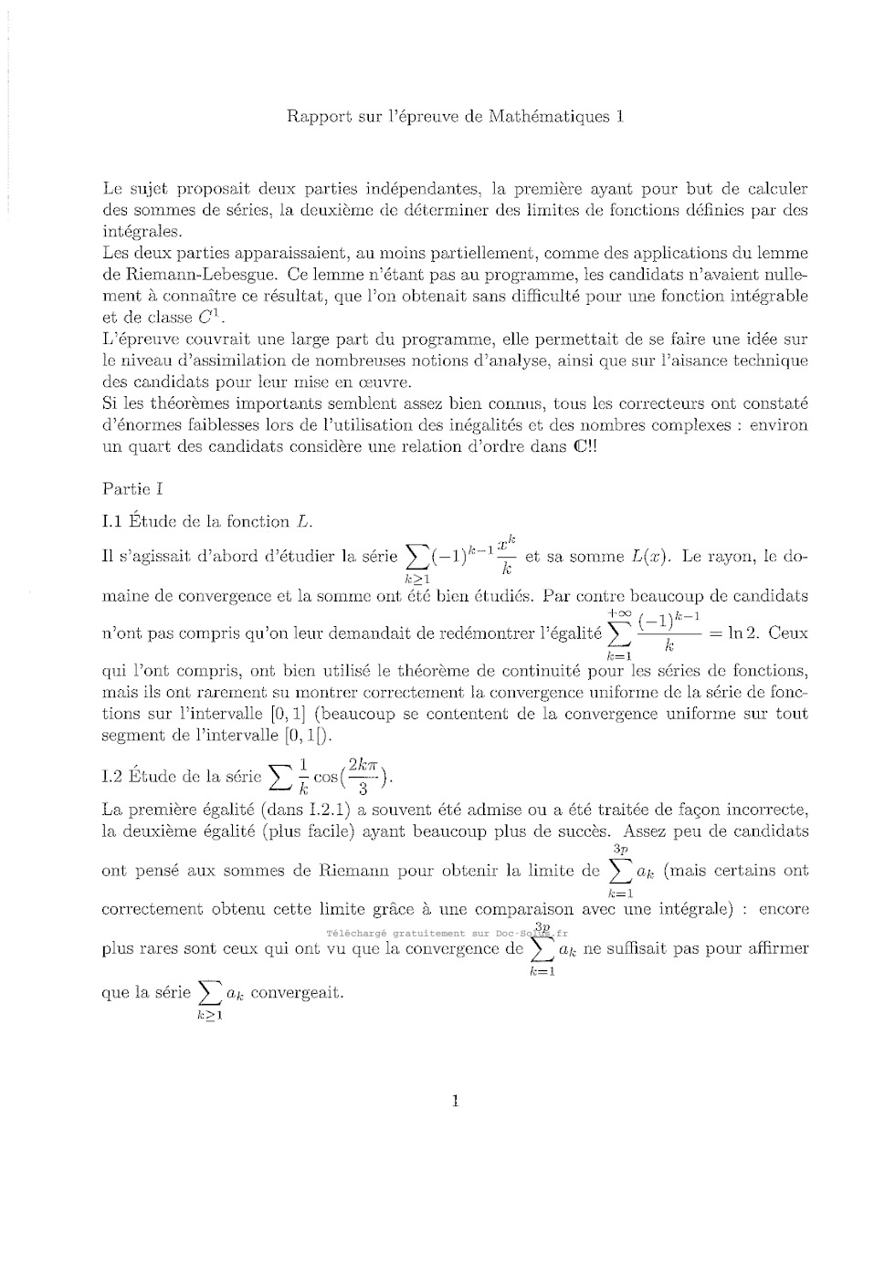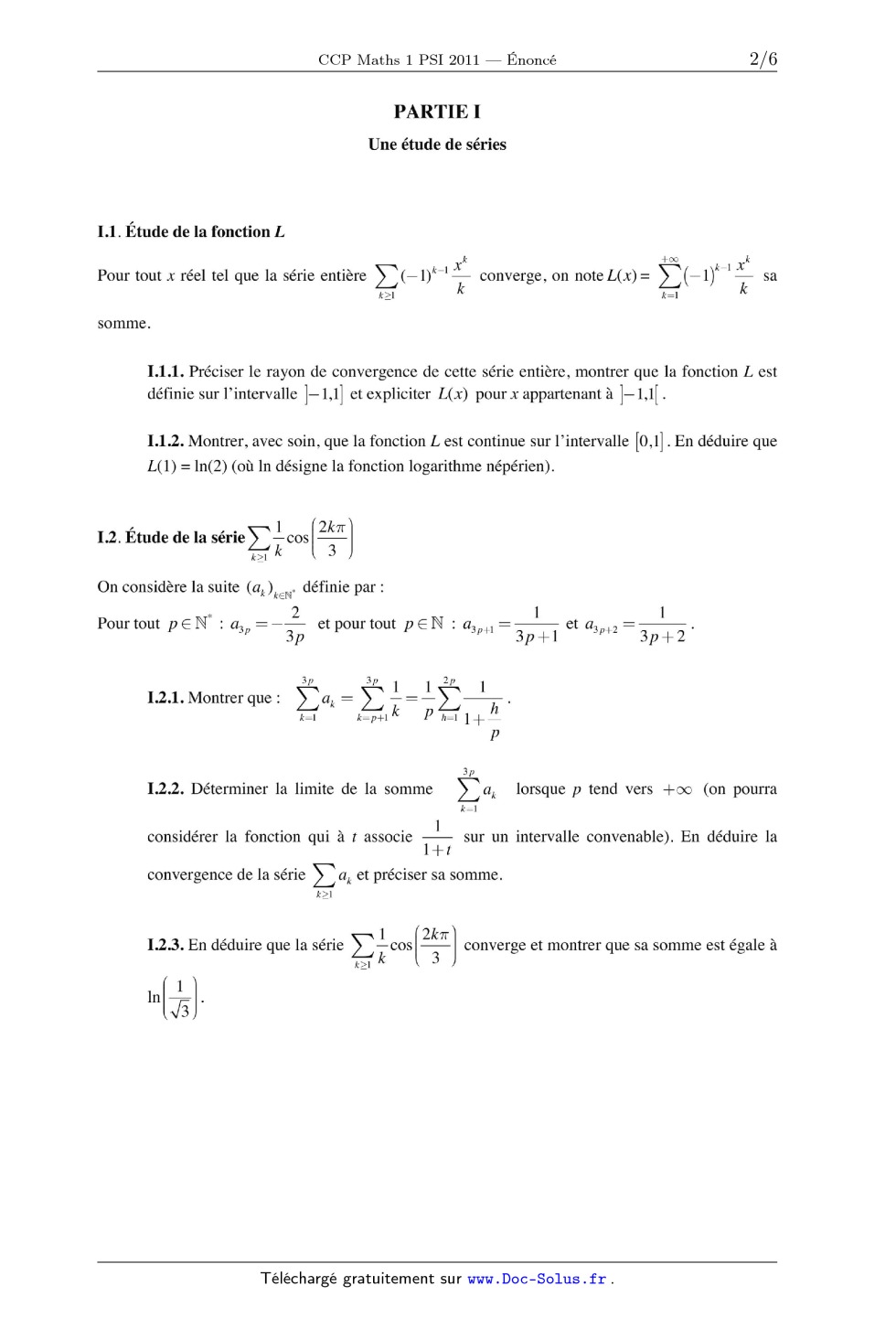 SESSION 2011 PSIM102 A CONCOURS COMMUNS POLYTECHNIQUES EPREUVE SPECIFIQUE - FILIERE PSI MATHEMATIQUES 1 Durée : 4 heures N.B. : Le candidat attachera la plus grande importance à la clarté, a la précision et a la concision de la rédaction. Si un candidat est amené à repérer ce qui peut lui sembler être une erreur d 'énoncé, il le signalera sur sa copie et devra poursuivre sa composition en expliquant les raisons des initiatives qu 'il a été amené à prendre. Les calculatrices sont autorisées Le sujet comporte 6 pages. Notations On note : |z| le module du nombre complexe z , ] un intervalle de [O,--Fool , f une fonction définie sur ] à valeurs dans R ou (C , g une fonction définie sur [O,+oo[ à valeurs dans R ou C . Sous réserve de son existence on note : Îg (x) = f f (t) g(xt)dt pour x EUR ]O,+oo[. ] Chaque fois qu'aucune confusion ne sera possible, on notera Î (x) au lieu de À (x) . Objectifs Pour différentes hypothèses sur la fonction f, sur l'intervalle J et pour deux choix de la fonction g, on se propose de déterminer la limite de À (x) lorsque le nombre réel x tend vers +oo . Dans la partie 1, on étudie un exemple explicite avec application à des calculs de sommes de séries. Dans la partie II, on considère une fonction f définie sur [O,+oo[ à valeurs réelles et l'objectif est d'obtenir la limite en +00 de Îg(x) lorsque g(t)= \sin(t) ,lorsque f est de classe C ' ou lorsque f est continue par morceaux. PARTIE I Une étude de séries 1.1. Étude de la fonction L k +oo k , , . .. 1 x 1 x Pour tout x reel tel que la serre entiere 5 (--1)" [? converge, on note L(x) : ê (-- 1)k 1Î sa [(à] k=l somme . 1.1.1. Préciser le rayon de convergence de cette série entière, montrer que la fonction L est définie sur l'intervalle ]-- 1,1] et expliciter L(x) pour x appartenant à ]-- 1,1[ . 1.1.2. Montrer, avec soin, que la fonction L est continue sur l'intervalle [0,1] . En déduire que L(l) : ln(2) (où ln désigne la fonction logarithme népérien). I ..2 Étude de la sérieZ% cos [ 2--k7T] [(>] 3 On considère la suite (ak ) keN. définie par : Pourtout EN*'a =--£ et ourtout EURN'd -- ] eta -- 1 p -- 3p p P ' 3p+l 3p+1 3[7+2 3p+2' 3P 1.2.1. Montrer que : 3zpak= Ë%= _Î_h k=l k=p+lk ph=11+_ p 1.2.2. Déterminer la limite de la somme Zak lorsque [9 tend vers +oo (on pourra k=l 1 considérer la fonction qui à t associe -- sur un intervalle convenable). En déduire la 1 + t convergence de la série Ê ak et préciser sa somme. k21 1.2..3 En déduire que la série 2% cos [<>] 2k7r 3 --] converge et montrer que sa somme est égale à 11%]- 1.3. Étude des séries 2 cos(ka) sin(ka) k et z k kZl k21 Pour te ]0,277[et n E N* , on note: g0(t) = .1 et S (t) = Ze"" . en _ 1 " On désigne par a un nombre réel fixé dans l'intervalle ]0,27r[. Pour simplifier l'écriture des démonstrations, on supposera que W 5 a < 27r . Dans cette partie, on désigne par f une fonction continue par morceaux sur l'intervalle [0,+oo[ a 1.3.1. Montrer que S" (t) = 90 (t)[e"""" -- e"] . 1.3.2. Montrer que la fonction ça est de classe C1 sur le segment [7r,a] . (1 1.3.3. Montrer que l'intégrale ] Ve""""0, il existe un réel positif A tel que f | f (t)| dt 5 5 . A [xr A 11.2.2. Le nombre réel A étant fixé, montrer que l'intégrale f f (t)e dt tend vers zéro 0 lorsque le nombre réel x tend vers +oo (on pourra utiliser une intégration par parties). +00 1123. En déduire la limite de Îg(x)= f (t)e'" dt lorsque le nombre réel x tend 0 vers +oo . Dans toute la suite du problème, on suppose que g(t) : |sin(t)l et on note simplement : f(x) = L+xf(t)lsin(xt)ldt . 11.3. Étude pour une fonction f particulière On suppose (dans cet exemple) que f désigne la fonction E définie par E (t) = e*' pour t E [O,+oo[ +00 et donc Ë(x)=f eÎ'|sin(xt)|dt pour xEUR]0,+oo[. 0 7l' 11.3.1. Pour 7 E R , calculer l'intégrale ()(fy) : f e" sin (y)dy . 0 II.3.2. Montrer que pour x E ]O,+oo[ : ... 1 +00 Îï E(x)=--f e X sin(u)ldu. x () (k+l)7r ÎË II.3.3. Exprimer pour tout k EUR Net pour toutxEUR R* , l'intégrale f e x k7r sin (u)ldu en J'l fonction de e *" et de 9(7) pour un 7 convenable. km" 1134. Justifier, pour x E l0,+oo[ ,la convergence de la série Ze " ; k20 +oc -- kl préciser sa somme E e -* . k=0 11.3.5. Expliciter Ë(x) pour xEUR]0,+oo[. Déterminer la limite de Ë(x) lorsque x tend vers +oo . 11.4. Étude générale On désigne de nouveau par f une fonction quelconque continue par morceaux sur l'intervalle +oo [O,--Fool telle que l'intégrale généralisée f | f (t)ldt converge et on note : 0 Î(x)= fo+oef(t)lsin(xt)ldt pour xEUR}0,+oo[. Il.4.1. Lemme préliminaire cos(2kt) +°° cos(2kt) --conver e,on ose h t = _ [(=] Pour tout tréel tel que la série Z . Montrer k21 que la fonction il est définie et continue sur R . Justifier l'égalité : Vt @ R, sin(t)l = Ê--Îh(r) . 7T 7l' Il.4.2. Limite de f (x) dans le cas C1 On suppose de plus que fest une fonction de classe C ' sur l'intervalle [0,+oo[. En utilisant les résultats obtenus en 112 et Il.4.l , déterminer la limite de Î (x) lorsque le réel x tend vers +oo . Le résultat est--il conforme avec celui obtenu pour la fonction E ? 11.4 .3. Cas d'une fonction continue par morceaux II.4.3.1. Une limite Étant donnés deux nombres réels fiet 6tels que 0 S 5 < 6, on considère l'intégrale 5 '.r F(x) : [ lsin(xt)|dt pour x E l0,+oo[ . Montrer que F(x) : if!) sin(u)l du . /3 _X x . ... x . ... 6x 7r On pose p la partie ent1ere de --et 61 la partie ent1ere de -- . Pourx > 7r W 5--5 , donner un encadrement de F (x) en fonction de p, q et x. 2 En déduire que F (x) tend vers--(ô -- 5) lorsque le nombre réel x tend vers +oo . 71" 11.432. Limite de f (x) dans le cas d'une fonction continue par morceaux Si J est un intervalle de [O,+oo[ et si f est une fonction continue par morceaux sur J à valeurs réelles et telle que l'intégrale ] \ f (t)l dt existe, on note toujours : ] Î (x) = f f(t)lsin(xt)l dt . J Quelle est la limite de Î (x) lo