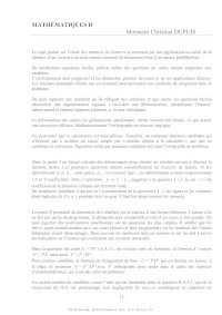 Soient p et n deux entiers naturels tels que 0 _<_ p ...<... n : 0 on note le,n]] l'ensemble des entiers k tels que p S k S n . . n n! 0 on rappelle la notat1on : p p!(n----p)f Le produit scalaire de deux vecteurs u et v d'un espace préhilbertien sera noté (u lv) . Objectifs : Dans ce problème, on définit la matrice de Gram d'une famille finie de vecteurs d'un espace préhilbertien réel. La première partie porte sur des calculs de déterminants, la valeur d'un des déterminants calculés servant à illustrer la quatrième partie. Dans la deuxième partie, on définit les matrices de Gram et on en étudie quelques propriétés. Les troisième et quatrième parties sont des applications de la deuxième partie. PARTIE I Les résultats de cette partie ne serviront que dans la partie IV. 1.1. Déterminant d p . Soit n e N . Pour p EUR [0,111] , on note A,. m (au) la matrice carrée de c/Ï/(pn_ p+1 (IR) dont le coefficient p+i+jw2 de la ligneiet de la colonnej est égalà al.,]. :( +_ 1 ] avec (i,j)efll,n...p+l]xül,n--p+lfl. p l'" On note a'p m det(Ap) . F 1.1.1. Expliciter les entiers r et 3 tels que al.,]. :( s ) pour les quatre coefficients a... a... a et a --p+l ' n--p+l,l n--p+l,n--p+l ' 1.1.2. Pour tout entier naturel n 2 2 calculer les déterminants dn, a'n_1 et dn_2 . 1.1.3. On suppose que la matrice AP possède au moins deux lignes. On note Li la ligne d'indice i. I.1.3.1 Dans le calcul de cz'p on effectue les opérations suivantes : pour i variant de n-------- p+l à 2, on retranche la ligne Lz._1 à la ligne L. (opération ! codée ïL.-- (-- Li "Li--1 ). Déterminer le coefficient d'indice (i, j) de la nouvelle ligne L. . l I.1.3.2 En déduire une relation entre ci}) et a'p+1 , puis en déduire a'p . 1.2. Déterminants DH et An. Pour 71 E N , on note Dn le déterminant de la matrice carrée de JL,, H (R) dont le coefficient de la ligne i et de la colonne j est (i + j )!, les lignes et les colonnes étant indexées de 0 à n. i+ ' On note Dn xdét((i+j)l). Avec les mêmes notations, on note An =det(( J)) pour 1 (i,j) efl0,nflxfi0,nfl. 1.2.1. Calculer les déterminants D0, D1, D2, A0, A1 et A2. 1.2.2. Donner une relation entre DH et An. 1.2.3. En déduire An puis B". PARTIE II A) Soit n E N * . II.A.1. Soit C x(ci,j) une matrice carrée de MAR). Pour tout entier ie[[l,n]], on note X 1. la matrice colonne de C/Man,1 (R) dont tous les coefficients sont nuls, sauf le coefficient de la ligne i qui vaut 1. II.A.1.1. Pour (i, j) EUR [Il,n]Xl[l,n]} , déterminer le produit 'XiCXj. II.A.1.2. En déduire que C a 0 si et seulement si pour tout couple (X Y ) de M.,... (R) >< WLM (R) on a 'XCY == 0. Soit E un espace euclidien de dimension n et soit fi == (el,...,en) une base de E . Soit A = (a...) la matrice carrée de %" ( R) telle que al.,]. : (e. lej) le produit scalaire de ei et 6 j . l Pour tout vecteur u de E , on note avec la même lettre majuscule U la matrice colonne des composantes du vecteur u relativement à la base /ÎÎ . II.A.2. Pour tout couple (x, y) de vecteurs de E , justifier l'égalité (xl y) : t)Ç4Y . Soit fi'm(e'l,...,e'n) une autre base de E et soit A'== (d'...) la matrice carrée de Æn(R) avec a'. . m(e'.|e'j). On note P la matrice de passage de la base ÎJ' à la base ÎJ". l,] l II.A.3. Pour tout vecteur u de E , on note U' la matrice colonne des composantes du vecteur u relativement àla base ÎÏ ' . II.A.3.1. Soit x un vecteur de E . Donner une relation entre les matrices X, X ' et P. II.A.3.2. Justifier l'égalité A'=--= 'PAP. II.A.3.3. Que devient l'égalité précédente lorsque Î>' ' est une base