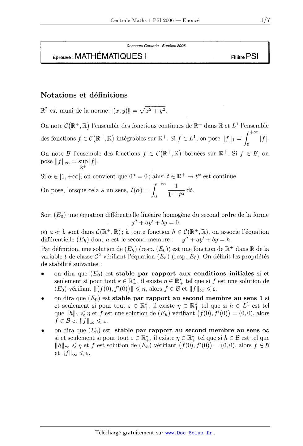 (E0) vérifiant H(f(0),f'(0))|l < 77, alors f E B et llf||OO < 5. . on dira que (EO) est stable par rapport au second membre au sens 1 si et seulement si pour tout 8 EUR Rï, il existe 77 EUR Rï tel que si h E L1 est tel que ||hl|1 < 77 et f est une solution de (Eh) vérifiant (f(0), f'(0)) = (0,0), alors fEURBet Hf||OO <5. 0 on dira que (EO) est stable par rapport au second membre au sens 00 si et seulement si pour tout 8 E là:... il existe 77 EUR Ri tel que si h E B est tel que ||hHOO < 77 et f est solution de (Eh) vérifiant (f(0), f'(0)) = (0,0), alors f E B et llf|loe < 6- Soit oz EUR [1,+oo[ et h EUR C(lR+, R). On note EG,}, l'équation différentielle linéaire : 1 Bd : " -- ( "" y 1 + ta Par définition, une solution de (Euh) est une fonction de R+ dans R de la variable t de classe C2 vérifiant (Ea,h). ÿ+y=h Pour l'équation homogène associée, notée (E...), . on dira que (Emo) est stable par rapport au paramètre si et seulement si pour tout (a, b) E R2 et pour tout 5 E R* , il existe 77 EUR R*+ tel que : si fi EUR [1,+oo[ vérifie la -- fi| < 77, f est solution de (Emo) et g est solu-- tion de (Egg) avec (f(0),f'(0)) = (g(0),g'(0)) = (a,b), alors f ---.g E B et "f _ glloo < 5- Objectifs et dépendance des parties L'objectif du problème est d'étudier le comportement des solutions de (Ea,0) vers +00, ainsi que les différentes notions de stabilité. La partie I étudie le cas de l'équation << limité à l'infini >> y" + y = h.