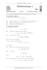 1 k dt < 1 /k dt w _ _ _ _ _ k 12 ,... 752 \ 6 ,... 153 II.D * En déduire que l l Un 7 _ \ 12n 12n2 puis que : l l l lnn!-nlnn n } îlnn } a } OE } O<Ë) Dans la suite on admettra que a = %ln(27r) et on pourra utiliser la formule de Stirling : l l l l lnn!=nlnn--n+älnn+äln(2w)+--+O <--) 12n n2 19 avril 2011 15:44 Page 1/4 GC) BY--NC-SA III L'identité d'Euler Dans cette partie, nous allons établir Fidentité d7Euler suivante : n!noe V 0 F = i. _ III.I On désigne par (fn)n>1 la suite de fonctions définies sur ]0, +oo{ par :