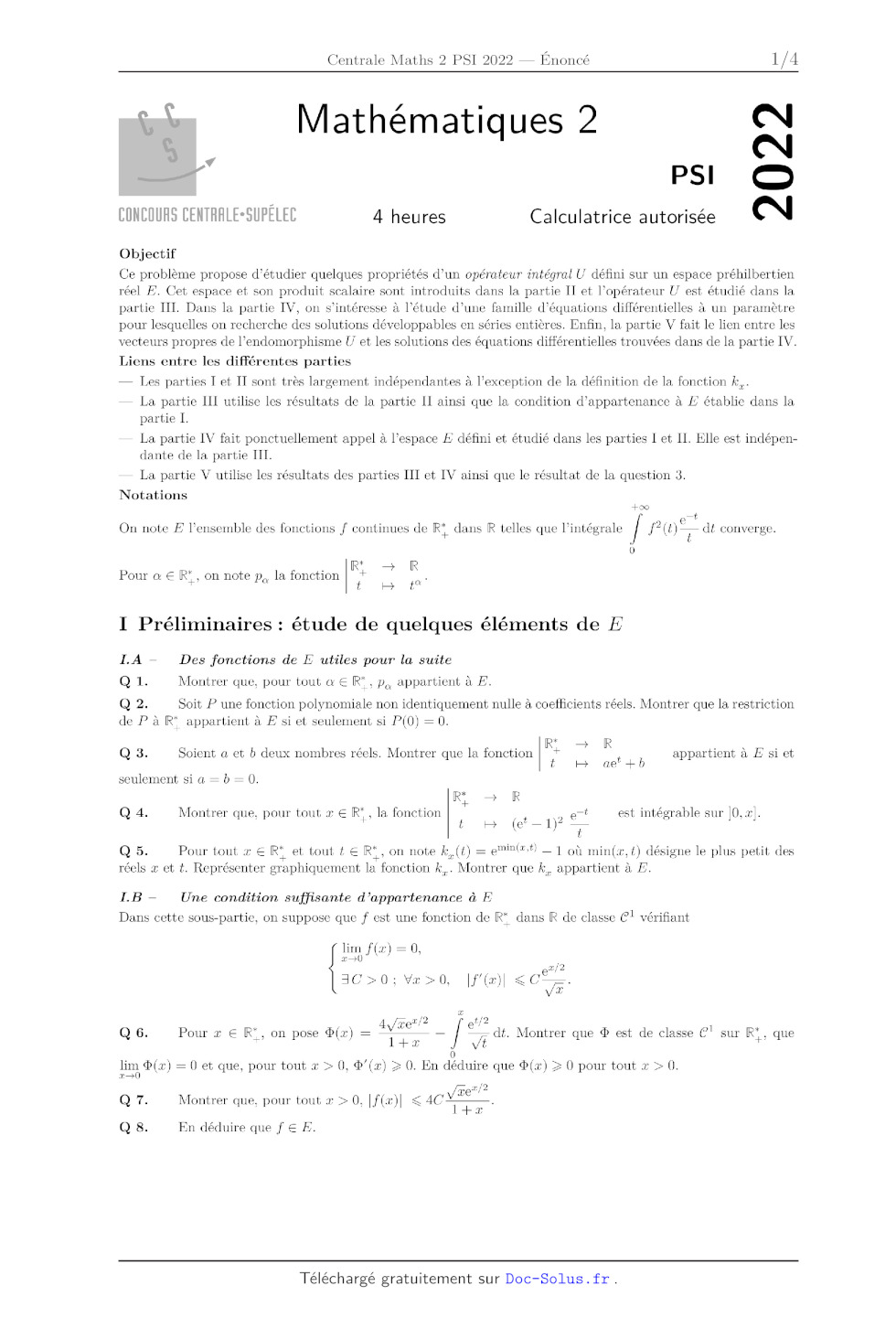 Q 7. Montrer que, pour tout æ > 0, [f(x)| < TE . x Q 8. En déduire que fe E. M046/2022-02-16 10:22:02 Page 1/4 (cc) BY-NC-SA IT Structure préhilbertienne de E +00 --t Q 9. Montrer que, si f et g sont deux fonctions de Æ, alors l'intégrale | f(t)g(t) _ dt est absolument 0 convergente. Q 10. En déduire que Æ est un sous-espace vectoriel de l'espace vectoriel C(R*, R) des fonctions continues sur KR à valeurs dans KR. +00 --t Pour toutes fonctions f EUR E et 9EUR E, on pose, {f | g) = | F9) -- dt. 0 Q 11. Montrer que l'on définit ainsi un produit scalaire sur Æ. La norme |:] associée à ce produit scalaire est donc définie pour toute fonction f EUR E par = (fro"r] 1/2 Q 12. Montrer que lin |A, | -- 0. On rappelle que, pour tout x > 0, k,(4) =