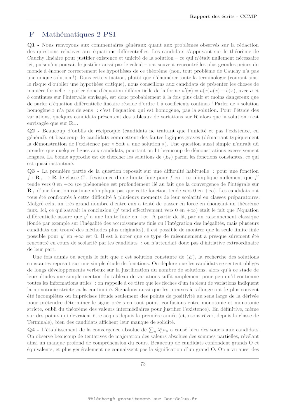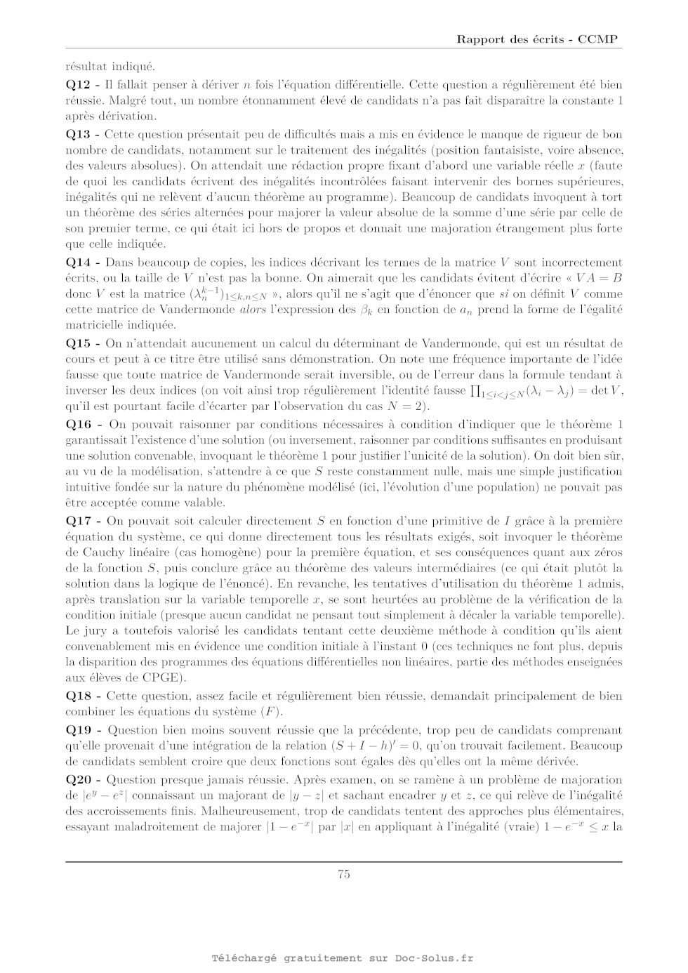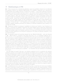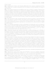 deux solutions constantes notées c1 et c2 telles que c1 < 0 < c2 . En déduire la valeur de c en fonction de c1 et c2 . Partie II : Séries de Dirichlet On propose dans cette partie d'étudier des séries de fonctions particulières appelées séries de Dirichlet. Définition 1 Une série de fonctions $ fn est dite de Dirichlet si n0 x R+ fn (x) = an en x , 2 où la suite de réels (an )nN vérifie, pour une valeur donnée M R+ , n N |an | M , 2n et la suite de réels (n )nN est strictement croissante et vérifie 0 = 0, lim n = +, et n+ Pour tout k N, on définit alors la quantité bk = + $ n = n+ O (n) . kn an . n=1 4 Montrer que pour tout k N, les réels bk sont bien définis. 5 Montrer que toute série de Dirichlet $ fn converge uniformément sur R+ . On n0 note alors f sa somme. Justifier que f est continue sur R+ . 6 Exprimer f (0) et lim f (x) en fonction de a0 et b0 . x+ 7 Soit k N . Montrer que f C k (R+ , R) et donner une expression de x f (k) (x). Exprimer ensuite f (k) (0) en fonction de bk . 8 Montrer que si f (x) = 0 pour tout x R+ alors an = 0 pour tout n N. Partie III : Relations sur les coe!cients de la série de Dirichlet Revenons au problème de Cauchy (C), et à l'étude de sa solution y C (R+ , R). Supposons dorénavant que y est la somme d'une série de Dirichlet, c'est-à-dire que x R+ y(x) = + $ an en x , n=0 où les suites (an )nN et (n )nN vérifient les propriétés mentionnées en Définition 1. On introduit également la fonction g C (R+ , R) définie par x R+ g(x) = ey(x) . 9 Exprimer a0 et b0 en fonction de la constante c introduite en partie I. 3 10 En utilisant l'équation (E) satisfaite par y, calculer b1 . 11 Montrer que pour tout k N , g (k) (0) = (1)k dk , où les coe"cients dk sont définis par d0 = 1, et k 1 dk = k $ i=1 % & k1 dki bi . i1 12 Soit k N . En utilisant l'équation (E), satisfaite par y, exhiber une relation de récurrence liant bk+1 , bk et dk . Partie IV : Approximation de la solution y Soit N N . Pour approcher la solution y de (C), on propose dans cette partie de tronquer toutes les sommes en s'arrêtant au terme de rang N . Les résultats de la Partie III permettent d'obtenir une approximation des quantités k définies pour tout k N par k = N $ kn an . n=1 On introduit également la fonction tronquée yN : R+ R définie par x R+ yN (x) = N $ an en x . n=0 En se donnant les valeurs de la suite (n )nN , on veut dans cette partie calculer les valeurs des coe"cients an pour n de 1 à N . On utilisera les notations a1 a2 N A = .. R , . et aN B= 13 Montrer que 0 1 .. . N 1 RN . M , 2N et déduire que yN converge uniformément vers y sur R+ . Proposer ensuite un intervalle J R+ où la majoration de yN y,J serait plus fine. yN y,R+ 4 14 Montrer que V A = B où V MN (R) est une matrice que l'on explicitera. 15 Prouver que le système V A = B admet une unique solution A RN . Partie V : Modèle de propagation d'épidémie SIR Pour modéliser la propagation d'une épidémie non létale au sein d'une population d'individus, on peut utiliser le modèle de propagation d'épidémie appelé SIR. Dans ce modèle, la population est séparée en trois groupes : · Le groupe des personnes susceptibles, n'ayant pas attrapé la maladie, est noté S et sa proportion au cours du temps est représentée par la fonction S C (R+ , R). · Le groupe des personnes infectées par la maladie est noté I et sa proportion au cours du temps est représentée par la fonction I C (R+ , R). · Le groupe des personnes ayant contracté la maladie puis récupéré est noté R. On suppose qu'un individu ne peut attraper la maladie qu'une seule fois dans sa vie. Une fois dans le groupe des individus récupérés, il y reste définitivement et ne redevient jamais susceptible. La proportion du groupe R au cours du temps est représentée par la fonction R C (R+ , R). On a ainsi la relation x R+ S(x) + I(x) + R(x) = 1. Dans un modèle de propagation d'épidémie SIR, ces trois fonctions sont de plus des solutions d'un problème de Cauchy associé à un système d'équations di!érentielles non linéaires S (x) = I(x)S(x) I (x) = I(x)S(x) I(x) (F ) : , R (x) = I(x) S(0) = S0 , I(0) = I0 , R(0) = R0 où S0 , I0 , R0 [0, 1] sont les conditions initiales. On admet dans la suite le résultat suivant : Théorème 1 Pour (S0 , I0 , R0 ) fixés, le problème de Cauchy (F) admet une unique so. I, . R) . sont les solutions lution (S, I, R) (C (R+ , R))3 . De plus, si (S, I, R) et (S, / , I. , R / ), alors associées aux conditions initiales (S0 , I0 , R0 ) et (S 0 0 0 / , I. , R /) (S0 , I0 , R0 ) = (S 0 0 0 x R+ 5 . . . (S(x), I(x), R(x)) = S(x), I(x), R(x) . 16 Supposons que S0 = 0. Donner l'expression du triplet solution (S, I, R) du système (F ). 17 Montrer que si S0 > 0 alors la fonction S du triplet solution (S, I, R) de