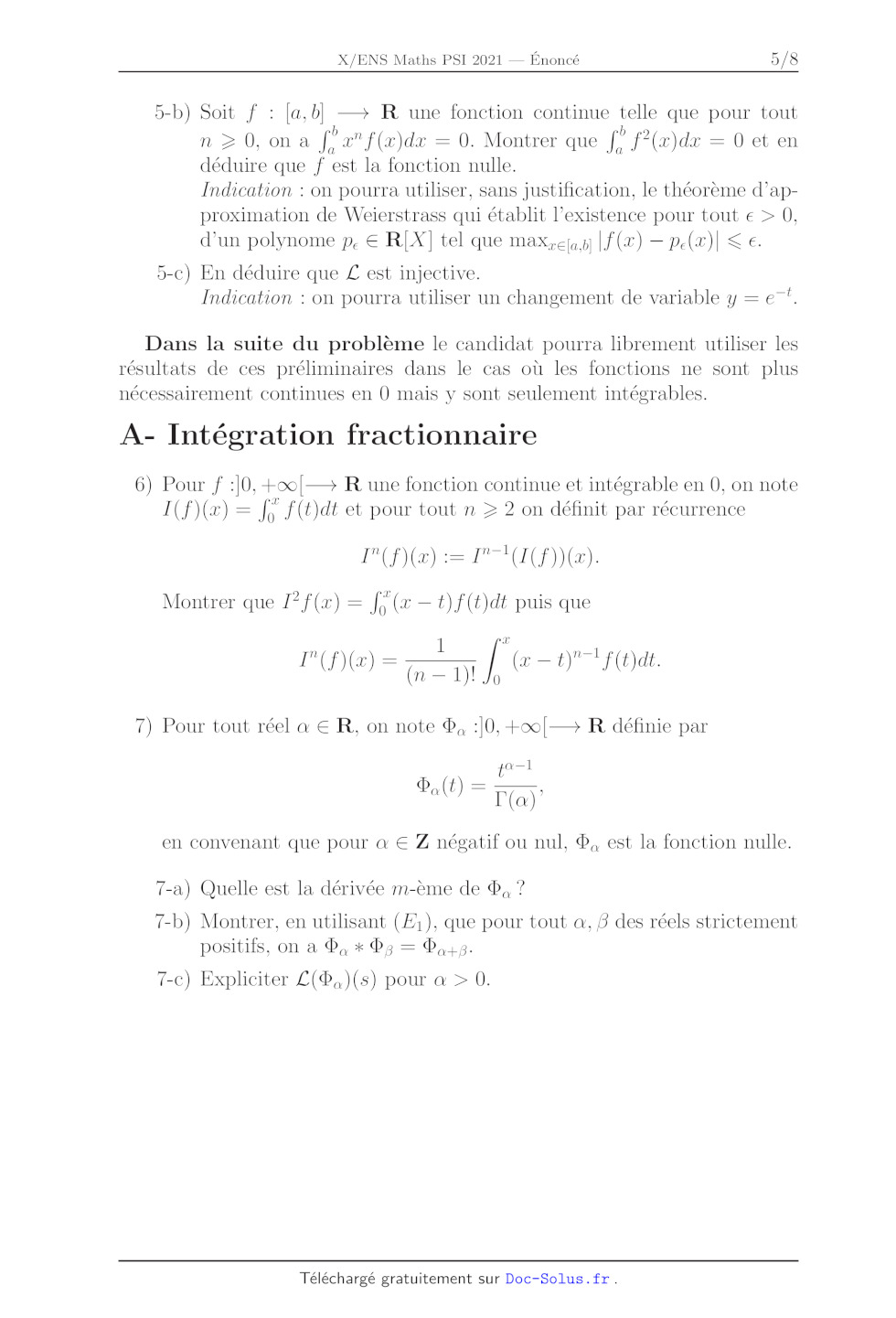 d'un polynome pe EUR R|X1 tel que max,eun | f(x) -- pe(x)| < EUR: 5-c) En déduire que £ est injective. Indication : on pourra utiliser un changement de variable y = e"*. Dans la suite du problème le candidat pourra librement utiliser les résultats de ces préliminaires dans le cas où les fonctions ne sont plus nécessairement continues en 0 mais y sont seulement intégrables. A- Intégration fractionnaire 6) pr : :]0 ou R une fonction continue et intégrable en 0, on note = | f t)dt et pour tout n > 2 on définit par récurrence