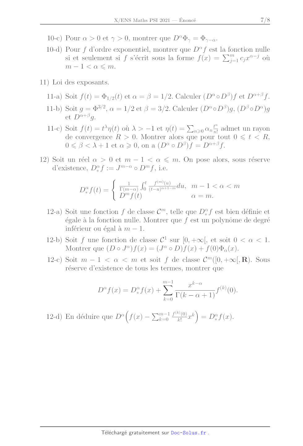 10) Etant donné un réel a > 0, on note m l'entier tel que m -- 1 < a < m, et on définit D* := Do J"T%, ï.e., sous réserve d'existence. m (1 pt Et) _ pre Pere dent) mic a cm D" $(+) à m et on note D l'opérateur identité. Remarque : on ne demande pas au candidat de donner des conditions nécessaires pour l'existence de D°'f. 10-a) Pour tout à > 0, expliciter D*o J°