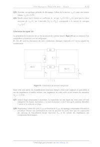 -- lorsque VIéd (t) < A(t), les interrupteurs T2 et T3 sont fermés et les interrupteurs T1 et T4 sont ouverts. Signaux f Figure 7 -- Signaux pour l'élaboration du signal vdéc (t) Q24. Pourquoi ne voit--on pas évoluer la tension vrécl (t) sur le chronogramme précédent ? 8/12 Q25. Dessiner, sur quelques périodes de découpage, l'allure de la tension vdéc (t) pour une tension réduite vréd(t) : 0,5V. Q26. Quelle valeur faut--il donner au coefficient K , tel que Vréd(t) = K.v (t) , pour que la valeur 00115 moyenne de vdéc (t), sur l'intervalle [t0; t0+Tdéc], corresponde à la tension de consigne Vcons (t0) ? Génération du signal A(t) La génération de la tension A(t) se fait au moyen du système bouclé (figure 8) qui se compose d'un comparateur à hystérésis et d'un intégrateur. R1, R2, R3 sont les résistances des trois conducteurs ohmiques respectifs et C est la capacité du condensateur. @ R2 ALI ] ' R3 ALI 2 ÎÎÎÎ Figure 8 -- Générateur de tension triangulaire Dans cette sous--partie, les Amplificateurs Linéaires Intégrés (ALI) sont supposés de gain infini et ont des impédances d'entrées infinies, une impédance de sortie nulle et une tension de saturation Vsm= i 15 V. Q27. Isoler l'étage comparateur à hystérésis. Le reproduire sur une figure sur votre copie où vous indiquerez les bornes inverseuse (--) et non inverseuse (+) de l'ALI qu'il contient. Identifier l'entrée et la sortie de cet étage. Q28. Représenter l'allure du cycle Vsortie en fonction de Ventrée du montage comparateur à hystérésis précédent. Donner une justification du sens de parcours du cycle, ainsi que les expressions des tensions de basculement faisant intervenir Vsat et les valeurs des impédances des composants électroniques. 9/12 Q29. Isoler l'étage intégrateur. Le reproduire dans une figure sur votre copie où vous indiquerez les bornes inverseuse (--) et non inverseuse (+) de l'ALI qu'il contient. Identifier l'entrée et la sortie de cet étage. Q30. Déterminer, en fonction des valeurs littérales des composants, l'équation différentielle qui lie dans le domaine temporel l'entrée et la sortie du montage intégrateur. Q31. Préciser les contraintes sur les composants du montage global qui permettent d'imposer, pour la tension A(t), une amplitude crête à crête de 2V (de --lV à IV) et une fréquence de 10 kHz. Q32. En pratique, les ALI comportent cinq connexions. À quoi correspondent les deux autres connexions non représentées de chacun des ALI ? 10/12 Document - Principe du moteur à quatre temps Dans un moteur multicylindre a 4 temps, le volant est relié a un vilebrequin qui assure le synchronisme du fonctionnement des pistons des différents cylindres. Les soupapes non représentées sur la figure ci--dessous sont commandées par des cames entraînées par le volant moteur. POSÏÜOH du piston au Position du piston au point mort haut (FMH) 1 point mort bas (PME) : V = V2 V = V1 1er temps : admission Il y a ouverture de la soupape d'admission. La rotation du volant entraîne avec la bielle l'abaissement du piston du point mort haut au point mort bas. La dépression produite aspire dans le cylindre le mélange air--essence. Il y a ensuite fermeture de la soupape d'admission. 2e temps : compression Pendant cette phase, la rotation du volant fait remonter le piston dans le cylindre jusqu'au point mort haut. Cette compression échauffe le mélange. 39 temps : explosion et détente La bougie d'allumage crée une étincelle qui provoque l'explosion, responsable d'une augmentation de la pression. Ensuite, le gaz se détend. En fin de détente, le piston est au point mort bas. 4e temps : échappement Il y a ouverture de la soupape d'échappement. La rotation du volant entraîne la remontée du piston jusqu'au point mort haut, ce qui chasse les gaz brûlés vers l'extérieur. Cycle de Beau de Rochas AB : admission isobare et isotherme du mélange air--essence, BC : compression adiabatique réversible, CD : compression isochore, DE : détente adiabatique réversible, EB : refroidissement isochore, BA : échappement isobare et isotherme. 11/12 Données Grandeurs chimiques Enthalpies standards de formation a 298 K : Corps CH4 H20 (g) CO2 | AfH° -- 74 -- 241 -- 3935 (kJ.mol") '8 '8 On rappelle que pour les corps purs simples, on a : AfH° : 0 kJ.mol'l. Masses molaires : | Atomes | H | C | O M | en_] | 1 | 12 | 16 g.mol Potentiels standards des couples de l'eau à 298 K et supposés encore vrais a 348 K : Couples HWH2 02/H20 E°(V) 0 1,23 Constantes physiques Constante des gaz parfait : R = 8,314 ].mol'l.K'l. Constante d'Avogadro : Na = 6,022 1023 mol]. Charge élémentaire : e = 1,602 10"19 C. Constante de Faraday : lF = 96 485 C.mol'l. Composition molaire de l'atmosphère 20 % de 02 et 80 % de N2. Données thermodynamiques Relation de Mayer : Cp... -- Cvm = R, où Cpm et CV... désignent respectivement les capacités thermiques molaires à pression et à volume constant pour un gaz parfait. Rapport des capacités thermiques pour un pm mélange air--essence : y = -- = 1,4. C vm Caractéristiques techniques du moteur PSA EB2 Architecture : 3 cylindres en ligne. Puissance maximale : 82 ch a 5 750 tr/min. Rapport volumétrique de compression ô=VPMB =É=11. VPMH Vi Cylindrée : 1 199 cm3. On rappelle que la cylindrée d'un moteur à combustion interne correspond au volume d'air aspiré par l'ensemble des cylindres du moteur lors un cycle. Caractéristiques d'une Peugeot 108 équipée du moteur EBZ Consommation mixte : -- Donnée constructeur : 4,3 l/ 100 km. -- Essai Autoplus n°1 450 : 5,7 l/100 km. Rejet moyen de CO2 donné par le constructeur : 99 g/km. Conversion d'unité, masse volumique et viscosité du carburant essence SP98 1 bar = 105 Pa. 1 ch : 735,4 W. p = 720 kg.m'3. Viscosité du carburant essence SP98 : n = 0,65.10_3P1. Caractéristiques d'une caténaire Masse volumique du cuivre : 9 000 kg.m'3. Section de la caténaire : 150 mm2. Hauteur d'une caténaire 
