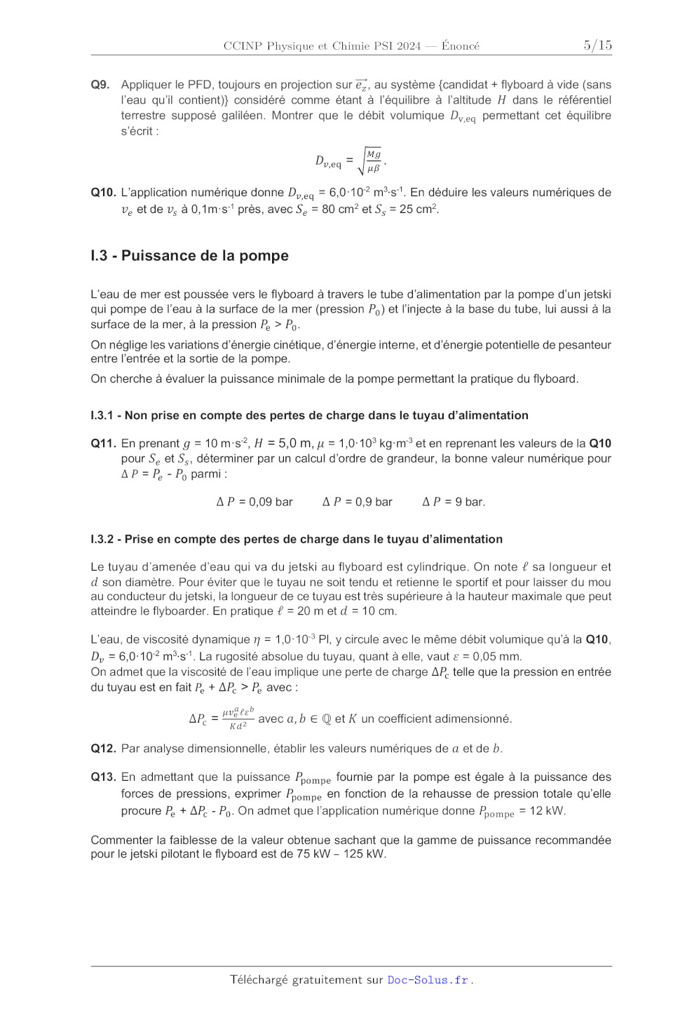 e d'un tuyau de section S, amenant jusqu'au flyboard de l'eau pompée par un