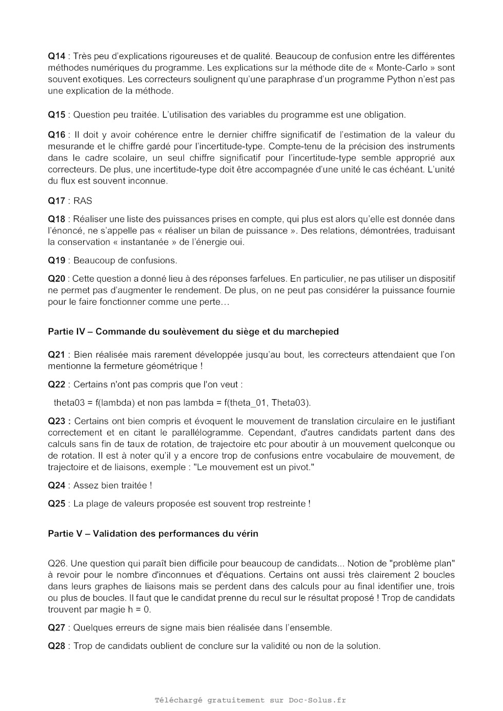 < 100 ms <2% Table 2 - Diagramme partiel des exigences associées à la boucle de vitesse La commande du contrôle moteur est implémentée dans un calculateur qui est un système numérique. L'objectif de cette partie est de vérifier que les modélisations continue et numérique sont identiques pour la commande du système. La structure retenue pour la boucle de vitesse est représentée figure 13. Vre f (p) Kcap KCAN + - Kp KCNA U(p) K 1 + p V(p) Kcap KCAN Commande continue Figure 13 - Schéma-bloc de la boucle de vitesse avec commande continue Q31. Transformer le schéma-bloc pour avoir un schéma-bloc à retour unitaire. Q32. Déterminer sous forme littérale et canonique la fonction de transfert en boucle fermée V(p) . Vre f (p) Q33. Déterminer le gain statique KF et la constante de temps F du système bouclé continu. La transmittance du système {hacheur + vérin} est modélisée (figure 14) par une fonction de transfert d'ordre 1. U(p) K 1 + p V(p) Figure 14 - Transmittance du système {hacheur + vérin} Q34. À partir de la transmittance littérale du premier ordre en v(t). V(p) de la figure 14, déduire une équation différentielle temporelle U(p) 14/20 Les différents signaux intervenant dans une commande numérique d'un processus continu sont définis sur la figure 15. va (t) vq (t) ve [k] t 0 t 0 Analogique Échantillonné t 0 Échantillonné avec bloqueur (BOZ) Figure 15 - Différents types de signaux L'échantillonnage de v(t) fournit la valeur v(kT e ) à la commande numérique à chaque instant d'échantillonnage. À chaque pas d'échantillonnage, le Bloqueur d'Ordre Zéro (BOZ) maintient la valeur de la tension u(kT e ) du kième échantillon sur une durée correspondant à la période d'échantillonnage T e . Pour la suite, on adopte les notations suivantes : - T e la période d'échantillonnage - v(kT e ) = vk la valeur de la vitesse dans le vérin à l'instant kT e , correspondant à la valeur au kième échantillon - v((k + 1)T e ) la valeur de la vitesse dans le vérin à l'instant (k + 1)T e , correspondant à la valeur au (k + 1)ième échantillon - u(kT e ) = uk la valeur de l'excitation à l'instant kT e . Cette valeur est constante pendant toute la période d'échantillonnage grâce au BOZ. t t Q35. La solution de l'équation différentielle est v(t) = Kuk (1 - e- ) + Vk e- . Écrire les équations obtenues pour t = (k + 1)T e et pour l'instant initial kT e . En déduire l'équation de récurrence en boucle ouverte sous la forme v((k + 1)T e ) + Av(kT e ) = Bu(kT e ) A et B seront explicitées en fonction de K et de . vre f (kT e ) Kcap KCAN + - Kp KCNA KCAN u(kT e ) équation récurrence Kcap v(kT e ) Kcap Carte de commande numérique Figure 16 - Schéma-bloc de la boucle de vitesse avec commande numérique 15/20 v(kT e ) Pour la suite et quelle que soit la valeur déterminée précédemment, la valeur de A sera choisie égale Te Te à -e- et celle de B à K(1 - e- ). Q36. À partir du schéma-bloc de la figure 16, montrer que l'équation de récurrence peut se mettre sous forme littérale du système en boucle fermée : v((k + 1)T e ) + A f v(kT e ) = B f vre f (kT e ) avec A f = A + BK p Kcna Kcap Kcan et B f = BK p Kcna Kcap Kcan Hypothèses : - à l'instant initial, v(kT e = 0) = v0 - un échelon d'excitation vre f (kT e ) = vcons u(kT e ) avec u(kT e ) échelon unitaire numérique - la solution k 0 à une excitation en échelon de cette équation de récurrence est la somme : · du régime transitoire de la forme K(-A f )k avec K une constante qui dépend de la condition initiale · du régime permanent pour k obtenu, sous réserve de convergence, à partir de l'équation de récurrence v((k + 1)T e ) = v(kT e ). Q37. Déterminer la solution de cette équation de récurrence à partir de l'état initial et de l'échelon d'amplitude de vitesse désirée. Le résultat sera donné, en fonction de k, v0 , A f , B f et de vcons , sous la forme v(kT e ) = régime transitoire + régime permanent. Q38. En analysant le régime transitoire de la solution de l'équation de récurrence, déterminer la condition nécessaire et suffisante permettant d'assurer la convergence donc la stabilité de la réponse en vitesse. Q39. Déterminer le gain statique du système bouclé numérique. La commande du système numérique est-elle identique à celle du modèle continu ? 16/20 En considérant que le modèle continu correspond au modèle numérique, une stratégie de correction pour valider les performances du cahier des charges doit maintenant être réalisée. Une simulation de la boucle de vitesse établie avec le modèle continu est donnée pour un correcteur K p de gain unitaire et une consigne Vcons = Vmax (figure 17). Figure 17 - Simulation de la boucle de vitesse Q40. À partir de la simulation de la boucle de vitesse, donner la valeur du gain statique et du temps caractéristique . Q41. En déduire la valeur du gain K p permettant de valider l'exigence de précision. Q42. Ce système permet-il de satisfaire les exigences de positionnement de l'utilisateur ? 17/20 ANNEXE 1 Programme Python Les points d'interrogation (?) situés dans le programme sont volontaires. Ils permettent de masquer certaines réponses à des questions du sujet. # -* - coding : u t f -8 -* - # B i b l i o t h èques i m p o r t numpy as np i m p o r t m a t p l o t l i b . p y p l o t as p l t i m p o r t numpy . random as r d # f o n c t i o n r é g r e s s i o n l i n é a i r e de y en f o n c t i o n de x , e t sa documentation d e f f ( x , y , ux , uy , N) : a , b = np . p o l y f i t ( x , y , 1 ) asim = np . zeros (N) bsim = np . zeros (N) f o r i i n range (N) : xsim = x + r d . normal ( 0 , ux ) ysim = y + r d . normal ( 0 , uy ) asim [ i ] , bsim [ i ] = np . p o l y f i t ( xsim , ysim , 1 ) ua = np . s t d ( asim , ddof = 1) ub = np . s t d ( bsim , ddof = 1) r e t u r n ( a , b , ua , ub ) """ x e t y s o n t l e s t a b l e a u x numpy d ' e n t r ée ux e t uy s o n t l e 