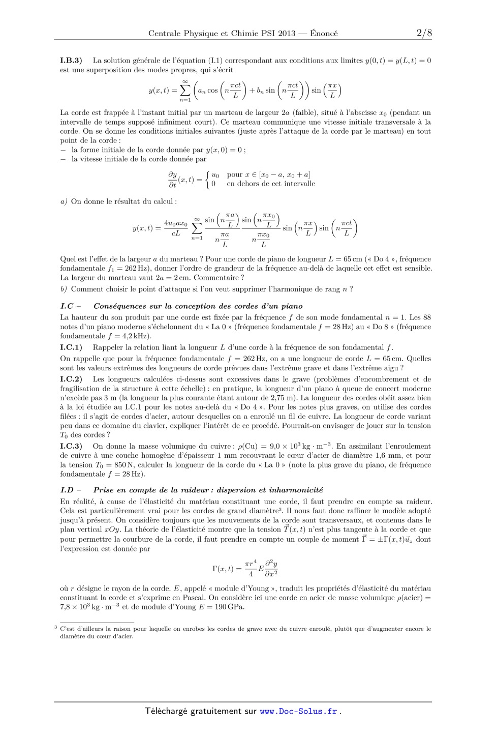 de l'acier valant 7,8 >< 103 kg -- m_3, calculer la célérité c des ondes transversales sur la corde. I.B -- Modes propres d'une corde de piano sans raideur, fioee'e auoe deuoe eoetrémités. Position du marteau sur la corde La corde est fixée à ses deux extrémités, 96 = 0 et 96 = L, ce qui impose les conditions aux limites : y(0,t) : y(L, t) = O. I.B.1) Qu'appelle--t--on onde stationnaire ? Montrer que les solutions en ondes stationnaires, physiquement acceptables, de l'équation (1.1) sont de la forme y(oe, t) : yo cos(wt + ga) cos(koe + (b). Quelle est la relation entre w et k ? I.B.2) Qu'appelle--t--on << modes propres >> et << fréquences propres >> de la