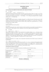 42#505-"+#47("-%+(-#.#42#50+-2%8#905$*%-%#:#,*#6*,-2%#-;$&%(5-"+*,-#0<+-"2-8 Tournez la page S.V.P. 18 TROISIÈME PARTIE ANNEXES EXTRAITS DE DOCUMENTATIONS POUR LIRE DANS UN FICHIER a) En Python f=open(name[ , mode[ , buffering ]]) Open a file, returning an File type object f. If the file cannot be opened, IOError is raised. name is the file name to be opened, and mode is a string indicating how the file is to be opened. The most commonly-used values of mode are 'r' for reading, 'w' for writing (truncating the file if it already exists), and 'a' for appending. f.readline() Reads a single line from the file ; a newline character (\n) is left at the end of the string, and is only omitted on the last line of the file if the file doesnt end in a newline. If f.readline() returns an empty string, the end of the file has been reached, while a blank line is represented by \n, a string containing only a single newline. f.readlines() Return a list of lines from the stream. f.close() When youre done with a file, call this function to close it and free up any system resources taken up by the open file. After calling f.close(), attempts to use the file object will automatically fail. b) En Scilab fd = mopen(file [, mode ]) opens a file in Scilab fd, a scalar : a file descriptor (its a positive integer). file : a character string containing the path of the file to open. mode : a character string specifying the access mode requested for the file. The parameter can have one of the following values : r : opens for reading (default). The file must exist, otherwise it fails. w : opens for writing. If the file exists, its contents are destroyed. a : opens for appending. It creates the file if it does not exist. mclose(fd) closes an opened file. fd, a scalar : the fd parameter returned by the function mopen is used as a file descriptor. txt = mgetl(file_desc [,m]) mgetl function allows to read a lines from an text file. file_desc, a character string giving the file name or an integer giving a logical unit returned by mopen. m, an integer scalar : a number of lines to read. Default value is -1. txt, a column vector of strings. If m is omitted or is -1 all lines till end of file occurs are read. If m is given mgetl tries to read exactly m lines. SYNTAXES PYTHON ET SCILAB En python, certaines des fonctions suivantes sont définies dans la librairie numpy. Convertir une chaîne de caractères en flottant Liste de valeurs équiréparties de 0 à 4 par pas de 0.1 Caractères spéciaux Tracé de y en fonction de x En python 3 En scilab float('14.32') float('-4.32\n') Evstr('14.32') linspace(0,4,41) 0:0.1:4 tabulation : \t Retour à la ligne : \n plot(x,y) plot(x,y) FIN DE LÉPREUVE