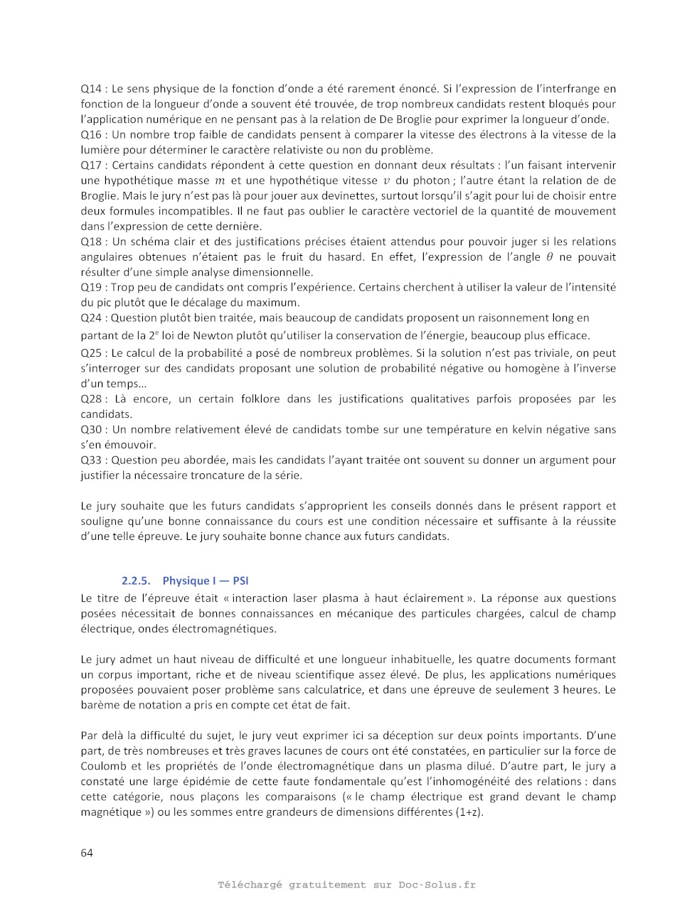 deplacant vers les x < 0. Page 4/9 Tournez la page S.V.P. Physique I, annee 2018 -- filiere PSI ) ) s tron 'élec ement l pe d Nap nt loca a ta m exci le plas On reprend l'etude de la question 16 mais en la traitant a deux dimensions. Pour simplifier, on suppose que le Front d'onde -(¡3&,)) paquet d'electrons, de vitesse !v = v! ux , injecte en M0 laser sous l'effet du laser vers l'interieur du plasma, passe par l'abscisse x = -3L a l'instant meme ou le front d'onde du laser arrive en M0 (voir ci-contre). 17 -- Determiner le decalage temporel entre les arrivees du front d'onde laser aux points M0 et M . En $ deduire l'expression du temps t0 (x,y) du passage du pa-0(¡3&,0) * quet d'electrons en un point (x,y) de la zone heterogene. +, 0 ¡3& En reprenant la condition d'emission de la question preZone Plasma Vide hétérogène cedente, avec desormais = (x,y,t), montrer que les homogène de surface points d'emission sont localises sur un droite que l'on caracterisera. Expliquer pourquoi l'on parle d' Emission Coherente de Sillage (ECS). Conclure cette partie en precisant les proprietes remarquables du spectre de l'ECS. III. -- Interaction d'une impulsion avec une feuille mince Cette partie s'appuie principalement sur le document iv. L'impulsion laser est celle decrite dans le document i dans le cas d'une cible solide. On etudie l'effet de l'expansion du plasma dans le vide sur le spectre du rayonnement emis afin d'estimer un ordre de grandeur de la temperature du plasma dans un modele simplifie. 18 -- Justifier que si la temperature e du plasma est assez elevee, alors on pourra, en premiere approximation, modeliser le plasma comme un gaz parfait. Montrer alors que la temperature e du plasma reste inchangee pendant l'expansion du plasma dans le vide. 19 -- Determiner l'expression de nL, max en fonction en de , L et de la densite particulaire electronique n0, max avant expansion. En deduire l'expression de la pulsation plasma maximale L, max en fonction de , L et de la pulsation plasma 0, max associee a la densite particulaire n0, max . Pour des eventuelles applications numeriques, on prendra par la suite 0, max 18,7 0 . On suppose dans un premier modele que la temperature e des electrons du plasma est independante de l'epaisseur de la cible choisie. 20 -- Estimer dans ce modele et a partir de la figure iv.b, un ordre de grandeur de la temperature electronique e du plasma. On suppose dans un second modele que l'energie cinetique totale des electrons du plasma ne depend pas de l'epaisseur du plasma. On note 0 l'epaisseur de la feuille la plus epaisse lors de l'experience (0 = 100 nm) et L0 la longueur caracteristique du gradient de ce plasma d'epaisseur 0 . 21 -- Comment varie alors la temperature electronique e du plasma avec l'epaisseur ? Determiner l'expression de L, max en fonction de , 0, max , 0 et L0 . Que penser de ces deux modeles compte-tenu des spectres experimentaux de la figure iv.b ? Page 5/9 Tournez la page S.V.P. Physique I, annee 2018 -- filiere PSI Document i : Modelisation du faisceau laser incident Le faisceau laser est modelise de la facon suivante : . (/0 !) -- L'amplitude du champ laser est constante durant la duree #0 . 0 (/) de l'impulsion T = 50 fs (1 fs = 10-15 s) et elle est nulle avant et apres cette impulsion (Fig i.a). La periode des os! cillations du champ laser est notee T0 et correspond dans le vide a une longueur d'onde 0 = 800 nm. L'energie totale de l'impulsion laser est WT . -- Le faisceau presente une symetrie cylindrique d'axe (Oz). ¡.0 (/) # Dans un plan transverse (z = constante), l'eclairement Fig. i.a Amplitude laser I(r,z) est uniforme dans un disque de rayon R(z) et il est nul au-dela (fig i.b). On rappelle la relation entre l'eclairement I(r,z) (en W · m-2 ) et l'amplitude du champ laser E(r,z) : I(r,z) = 12 0 cE(r,z)2 ou 0 designe la permittivite du vide et c = 3.108 m · s-1 la celerite de la lumiere dans le vide. On notera I0 (z) et E0 (z) l'eclairement et le champ electrique sur l'axe r = 0. 1 (20 /) 10 (/) 50 i.c 7 i.b 4 / 6 2 0 Cible au foyer 3 -- Le faisceau est focalise, par une lentille de dis2/0 tance focale f et de diametre egal a celui du p 7 7 faisceau laser D, sur une cible ( gaz ou so230 30 / lide ). L'angle est le demi-angle au sommet 6 du cone sous lequel est vue la lentille depuis la cible, placee au foyer O (fig. i.c). i.d -- L'allure du faisceau au voisinage du foyer O est representee sur la figure i.d , il est caracterise R2 0 et par les relations z0 = 00 , tan R 0 # Durée impulsion $ %2 8 R(z) = R0 1 + zz0 . Les conditions physiques experimentales sont rassemblees ci-contre. Diamètre faisceau 4 5 F Document ii : Cas ou la cible est un gaz La cible etant un gaz, on peut, pour comprendre le mecanisme d'emission d'impulsions attosecondes, se ramener a l'interaction d'un champ electrique laser avec un atome, par exemple l'hydrogene. Avant l'arrivee de l'impulsion laser, l'electron de l'atome d'hydrogene est au repos dans son etat fondamental caracterise par une energie potentielle negative -W0 . On represente, en mecanique quantique, l'electron par un paquet d'ondes stationnaires. (Fig ii.a) Page 6/9 Tournez la page S.V.P. Physique I, annee 2018 -- filiere PSI 89($) ii.a $ 80 89($) ii.b $0 $ ionisation 80 Electron à l'état fondamental 89($) 89($) ii.c ii.d photon 8c 8c $ $ accélération 80 recombinaison Dans le cadre d'un modele semi-classique qui donne des resultats satisfaisants, on peut decomposer le mecanisme d'emission d'impulsions en trois etapes : -- Premiere etape (Fig ii.b) : sous l'influence du champ laser, le puits de potentiel dans lequel se trouve l'electron de l'atome d'hydrogene est modifie et la hauteur de la barriere de potentiel s'annule. L'electron s'extrait alors de l'attraction coulombienne due au noyau atomique. En realite l'ionisation peut avoir lieu par effet tunnel avant l'annulation de la barriere de potentiel. Nous n'etudierons pas cette possibilite dans ce probleme. -- Deuxieme etape (Fig ii.c
