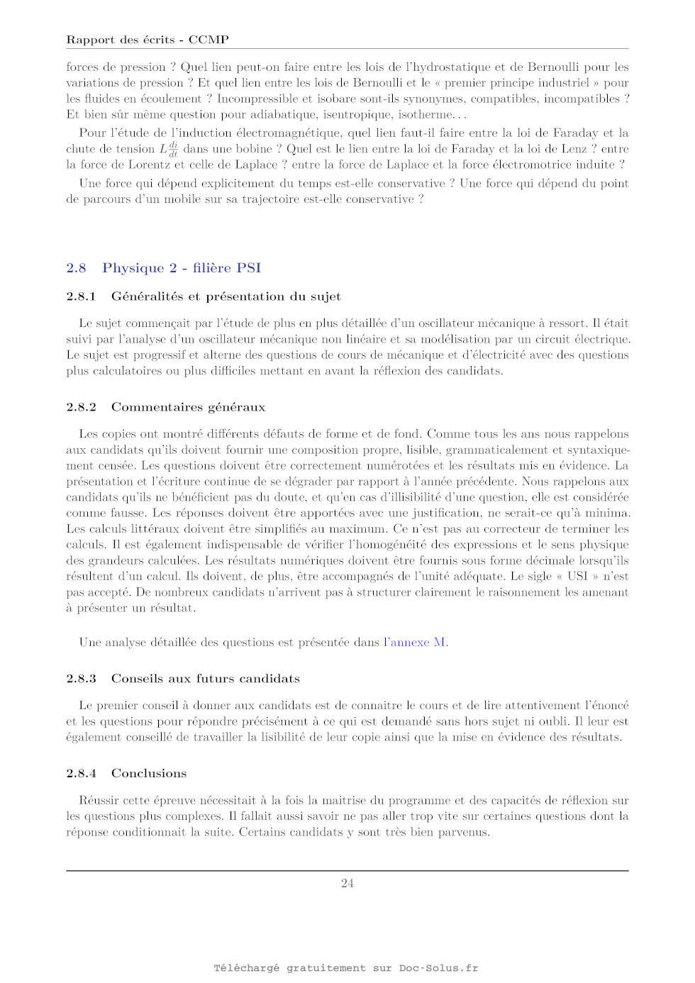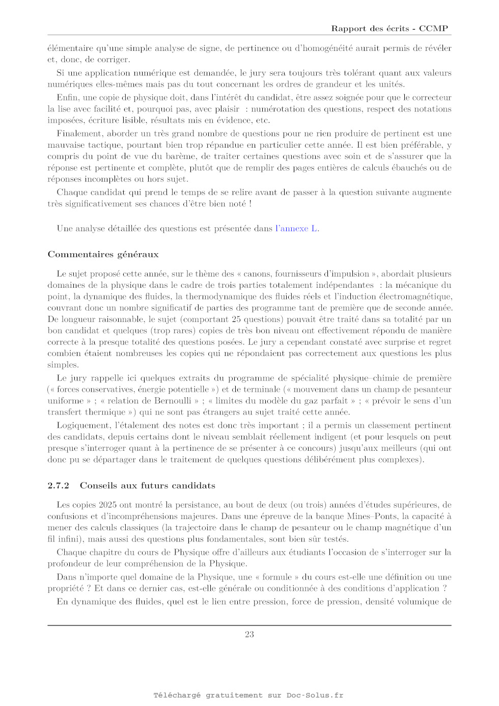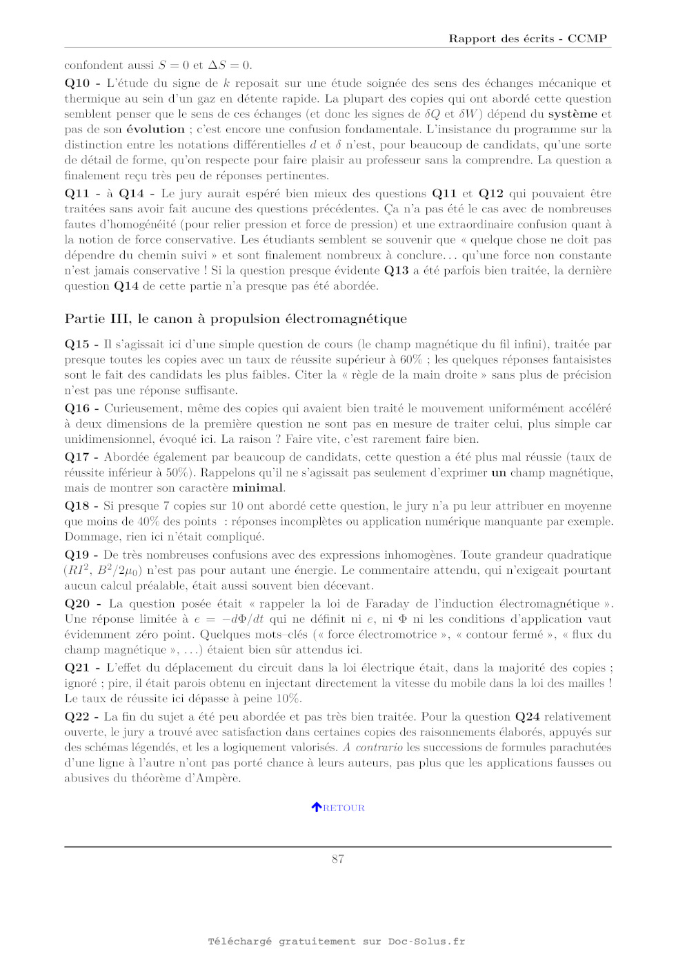 abscisse x < 0. La ligne est fermée par le projectile à l'abscisse X(t). Le mouvement de celui-ci démarre en X(0) = 0 et se termine par l'éjection en X (At) -- £. La résistance électrique R(X) du circuit, tout comme l'inductance propre L(X), dépendent a priori de la progression du projectile dans le canon. Le courant /(t) est donc variable. On note m la masse du projectile et on néglige le poids et tous les frottements. FIGURE 7 -- Le propulseur d'un canon électromagnétique et son schéma équivalent Les rails de guidage, distants de d, sont formés d'un matériau conducteur de conductivité 7, de hauteur h et d'épaisseur e. D -- 20. Rappeler la loi de Faraday de l'induction électromagnétique. On distingue parfois deux situations d'induction : « circuit fixe dans un champ magnétique variable » (induction de Neumann) et « circuit mobile dans un champ magnétique statique » (induction de Lorentz). Que dire de cette distinction dans le cas de la figure 77? . Établir l'équation électrique reliant Æo, les fonctions L(X), R(X), I(t), X(t) et leurs dérivées. d£ . Justifier que la force propulsive est F = 1°(t)--- ; en déduire l'équation mécanique qui dX ? décrit le mouvement du projectile. . L'argument « la longueur des rails d'alimentation est {, indépendamment de la position du projectile » pourrait servir à justifier un modèle où R(X) = cte. En limitant votre argumentation à quelques lignes au maximum, expliquer pourquoi cet argument est in- correct. Dans la suite on négligera la résistance électrique du projectile et la résistance interne du générateur. Justifier le modèle linéaire, R(X) = p X et exprimer p en fonction des caractéristiques du rail de guidage. . En négligeant les effets de bord, on pourra en première approximation considérer le champ magnétique B , dans le plan 2 = 0 où se trouve le projectile, comme uniforme dans chaque zone de l'espace (entre les rails et hors de ceux-ci). Montrer, en précisant les hypothèses ou approximations nécessaires, qu'entre les rails il vaut Bo © ol/h; on pourra s'inspirer du modèle du solénoïde infini. Page 6/7 Physique I, année 2025 -- filière PSI En déduire l'expression de de. Les équations différentielles du mouvement prennent la forme non linéaire ci-après, qui ne permet qu'une résolution numérique : ax = al? et X(t#)I(4)+7 ee | x Te = B dt dt dt D -- 25. Exprimer les constantes positives à, 6 et T7 en fonction des données du problème. Préciser la dimension de 7 et son interprétation physique. FIN DE L'ÉPREUVE Page 7/7