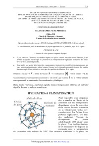 E! 24 -- On suppose que RO < R. Établir que la vitesse du fluide est f A--'D(R--RO)2 pour rSR0 4an A--P(R+r--2RO)(R--r) pour rZ R0 \4an u(r)=< E! 25 -- Tracer l'allure de u(r) pour 0 S r S R. On dit que l'écoulement présente une zone bouchon. D'où vient cette dénomination '? []]-2 Caractérisation expérimentale d'un fluide de Bingham E! 26 -- Afin de vérifier la pertinence du modèle, on mesure la chute de pression R R AP = Pe -- Ps et le débit volumique Q = Ju (r) 27zrdr . Montrer que Q = J7zr27ÿ dr . 0 0 RAP Ü27 -- On note Tp la contrainte à la paroi : Tp = {(R) = 2--. Démontrer la for- . . U 1 'p . . . , . mule de Rab1nov1tob Q3 =--d=--3JT2)/dï, ou Ud = Q2 est la V1tesse delu- 7zR TP 0 7zR tante. Dans ce qui suit, cette formule est mise en oeuvre pour permettre une exploitation facile des résultats expérimentaux. E! 28 -- Appliquant cette formule a un fluide de Bingham, montrer que, en négli- . R 8L geant le terme d'ordre 4 en 3, on obtient & = --(AP -- APO) , où APO = TS T R 8L77p 3R P est la pression d1fféren bielle orifiq ue. D 29 -- Quel est l'écart minimal de pression entre l'entrée et la sortie du tuyau pour que l'écoulement se produise '? Comment peut-on avoir accès expérimentale- ment à cette grandeur '? E! 30 -- Au vu de la Fig. 5, le modèle de Bingham est-il fondé '? 7/8 Physique 11200 7. Filière PSI. 3.53 E'. "." 1.5- F1r'ÿ. & -- Résultats rrpëræïwif'-iiaitiifl' de lu.. thèse de M. Da-rüomrt {ËÜÜ&_Ê. pour diverses fractions [.'ÜËH-ïïH-ÜHt'S dr ;m-ri-är-ulsæ. Les limites .E-':JILE des gra-irËrfi 3Jü'Æi?' la 'HLüffiëfiiäffüffli. D 31 -- La caractérisation du fluide de Bingham exige la détermination expéri- mentale du seuil z's et de %. Les grandeurs mesurées sont la chute de pression RAP . AP et le débit volumique Q. La contrainte à la paroi TP = Î = Ts + 77p }/(R ) se déduit de la mesure de AP. En dérivant par rapport a TP le logarithme de la TP formule de Rabinovitch ln(%)=ln ljfiy'df =--31n(rp)+1n[f(fp)], où 3 7117 0 . . , . . . Ud 1 \ dln(RAP/2L) )/p =)/(R), etabhr la relation }/p =Î 3+; ,ou V= dln(U /R) d D 32 -- Comment peut-on déterminer expérimentalement % '? FIN DU PROBLÈME FIN DE L'ÉPREUVE Combustion du méthane dans un ]1ydra te. TBAB (pour Tetra-n-Butyl Ammonium Bromure) ! nom commun du Bromure de Tetra-ButylAmmonium CH3(CH2)3N+BrÏ 8/8