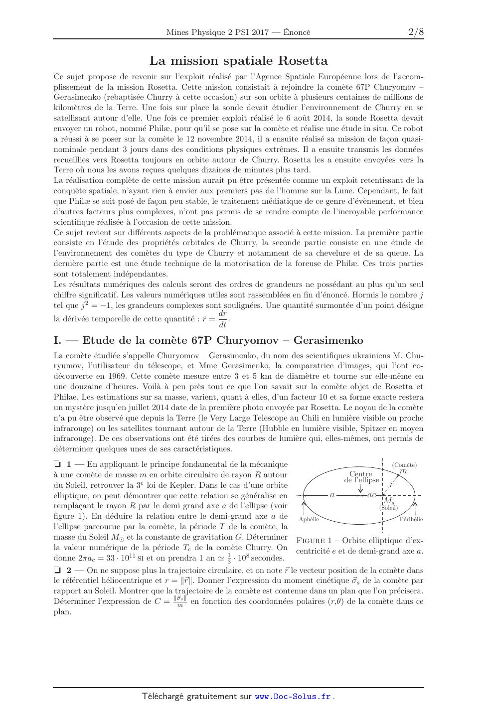 le cas ou 0 < < 2 . En deduire une relation entre V , E, et . 20 -- Determiner l'expression de la puissance electrique absorbee par le moteur Pa en fonction de V , I et puis en fonction de E, I et . Quelle relation existe-t-il entre cette puissance electrique Pa et la puissance mecanique electromagnetique Pm recue par le rotor ? Page 4/7 Physique II, annee 2017 -- filiere PSI 21 -- Exprimer le couple electromagnetique C developpe par le moteur en fonction de A, I et . Pour une intensite efficace I donnee, que doit-on faire pour maximiser le couple developpe par la machine ? De quelle unique variable le couple depend-il alors ? A quel autre moteur ce fonctionnement fait-il penser ? 22 -- On se placera sur un point de fonctionnement a = 0, I = IN , et n = 1500 tr · min-1 . Que vaut le moment du couple C developpe par le moteur ? Representer le diagramme vectoriel representatif du fonctionnement. Placer les vecteurs representatifs des complexes E, V , I. En deduire les expressions de V et . Calculer leurs valeurs numeriques correspondantes. On pourra considerer que 13 12 . III.B. -- Etude simplifiee de la logique de commande mli Le moteur est alimente par un onduleur a commande mli (Modulation de Largeur d'Impulsion). Nous simplifierons l'etude de l'onduleur par le schema monophase de la partie gauche de la figure 4. +-cc Comp. $4 !4 $1 !1 ¡-cc Vers la commande de 11 et 13 -13 0 volt #ch + -T -C Charge " ch +-cc Comp. $2 !2 $3 !3 Vers la commande de 12 et 14 -24 ¡-cc 0 volt Fig. 4 Schema de l'onduleur (a gauche) et de son circuit de commande (a droite) Les deux comparateurs a base d'ali supposes ideaux sont alimentes entre +Vcc et -Vcc . La tension de sortie de ces deux comparateurs commute entre +Vcc et -Vcc . Lorsque la tension de sortie d'un comparateur est au niveau +Vcc , les interrupteurs associes sont commandes a la fermeture ; quand cette tension est au niveau -Vcc , les interrupteurs associes sont commandes a l'ouverture. Les tensions VT et VC sont definies sur la partie droite de la figure 4 representant le circuit de commande de l'onduleur. Leurs chronogrammmes sont representes sur la figure 5. 23 -- Representer sur la copie en concordance des temps les signaux VT , VC ainsi que les chronogrammes de V13 et V24 . Calculer la date t1 en fonction de T , VC et VT,m . +-T,m -C 1 0 2 21 -T ¡-T,m Fig. 5 Chronogrammmes des tensions VT et VC . 24 -- En deduire l'allure de la tension vch (t). Determiner l'expression du rapport cyclique de la tension vch (t) en fonction de VC et VT,m . Quel inconvenient presente ce type de commande ? La commande reelle permet d'alimenter le moteur avec une tension dont la forme est representee sur la figure 6. Les angles 1 , 2 , 3 , 4 , 5 , 6 # $ compris dans l'intervalle 0, et representes sur la figure 6 sont fixes, les suivants, situes dans les # $ # 3 $ # 23 $ intervalles 2 , , , 2 et 2 , 2 s'en deduisent par symetrie. eff de la tension v (t) en fonction des angles 25 -- Exprimer la valeur efficace Vch i=1,...,6 et de la ch tension E. Si l'on note f la frequence du fondamental de vch (t), la commande mli permet de faire en sorte que eff Vch f = cte et d'eliminer les harmoniques de tension les plus genants. Page 5/7 Tournez la page S.V.P. La mission spatiale Rosetta # ch ' 0 3& 2 % 1 %2 % 3 %4 % 5 %6 & 2 & 2& ( = )* ¡' Fig. 6 Commande reelle d'alimentation 26 -- Les symetries du signal vch permettent d'etablir que seuls les harmoniques de rangs impairs figurent dans son spectre. Donner l'allure de ce spectre en precisant les positions des quatre premiers harmoniques. Montrer qualitativement que les 6 parametres i=1,...,6 de la commande mli permettent eff et d'autre part de faire en sorte que le premier harmonique d'ajuster d'une part la valeur efficace de Vch d'amplitude non nulle ne soit que d'ordre 13. III.C. -- Etude d'une commande mli numerique, precalculee +! Pour chaque angle i=1,··· ,6 predetermine par un calculateur, on fabrique un signal de base note mi (t) dont le chronogramme et la decomposition de Fourier sont donnes sur la figure 7. Ces signaux de base permettent de reconstruire la tension d'alimentation du moteur. ' &+% ! %! ¡' & 2 &¡%! 3& 2 2&¡%! & 2& ( 4' X cos [(2, + 1) %! ] sin [(2, + 1) )*] +! (*) = ¡¡ 2, + 1 & "=0 +1 Fig. 7 Signal de base. 27 -- Representer sur un meme graphe les signaux m1 et m2 en fonction de puis en deduire le graphe de m1 - m2 en fonction de . En deduire l'expression de la tension vch (t) de la figure 6 en fonction des signaux de base mi=1,··· ,6 (t). 28 -- Determiner la relation que doivent verifier les angles i afin que l'on puisse eliminer l'harmonique d'ordre 5 dans le spectre de vch . III.D. -- Utilisation de la technique de surmodulation On realise un decoupage de la commande mli a frequence elevee fd devant la frequence f de cette commande : fd f . Par exemple, pour une frequence f = 50 Hz, on prendra fd = 1 kHz. On note le rapport cyclique de la tension de decoupage D(t) et l'on donne sa decomposition de Fourier % D (t) = A0 + Ak sin [kd t + k ]. Les signaux decoupe et de decoupe sont representes sur la figure 8. k=1 29 -- Exprimer A0 en fonction de . (t) = v (t)× 30 -- Determiner l'expression de la valeur instantanee vch,F (t) du fondamental de vch ch ,eff D(t). En deduire l'expression de sa valeur efficace Vch,F en fonction de E, et des angles i=1,··· ,6 . 31 -- Quel est l'interet d'utiliser cette technique de surmodulation ? Page 6/7 Physique II, annee 2017 -- filiere PSI # ch '¡ $(*) # ch Zoom 1 ' 2 2 % 1 %2 % 3 %4 % 5 %6 -! # !# 2 -! # !# Fig. 8 Decoupage de la commande mli (a gauche) et signal de decoupe (a droite) (t) correspondant a la tension d'alimentation 32 -- Representer l'allure du spectre du signal vch du moteur de la foreuse. Conclure. FIN DE LA PARTIE III Donnees numeriques · Constante de la gravitation : G = 6,7 × 10-11 m3 · kg-1 · s-2 · Vitesse de la lumiere : c = 3 × 108 m · s-1 . · Masse du Soleil : M = 2 × 1030 kg. · Luminosite du Soleil : L = 4 × 1026 W