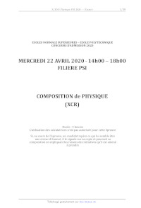 <0.0006+000 : 1.348e-004 Density Plot: |B|, Tesla FIG. 4 -- Lignes de champ obtenues par résolution numérique. 26. À quelle condition géométrique peut-on considérer que les lignes de champ restent parallèles entre elles dans l'entrefer ? On supposera cette condition vérifiée dans tout le sujet. 27. D'après la figure, que peut-on dire du flux magnétique ? 28. Montrer que le champ magnétique B, dans l'entrefer vérifie la relation B, = a avec a une constante à déterminer en fonction de 54, Sr, L, Lo, N, £ et ju. 29. On place maintenant un capteur à effet Hall dans l'entrefer. En fixant le plus précisé- ment possible un courant d'intensité I continu, montrer que l'on récupère une tension VH proportionnelle à l'intensité (4). Déterminer le coefficient de proportionnalité. On s'intéresse maintenant aux pertes fer. 30. Quels sont les deux phénomènes associés aux pertes fer ? On détaillera l'origine de chaque perte. Quel autre type de perte existe dans ce système ? 31. En pratique, comme règle empirique, on considère que les pertes fer sont minimisées si le produit N x à x f (N est le nombre de spires du bobinage, f la fréquence du courant d'intensité i(t)) est le plus faible possible. Justifier cette règle empirique. 32. Pourquoi doit-on alors être vigilant lorsqu'on utilise ce type de capteur avec un courant d'intensité 4(t) périodique non-sinusoïdal quelconque même de faible amplitude ? II3 Mesure expérimentale Pour des raisons pratiques, les mesures de précision sont faites à de basses températures (cf prochaine partie). On donne ci-dessous le résultat expérimental de la mesure de la résistance Hall Rx d'un gaz d'électrons d'un échantillon GaAs/AlGaAs en fonction du champ magnétique appliqué à une température de 0,1 K. X/ENS Physique PSI 2020 -- Énoncé R, (KQ) FIG. 5 --- Mesure expérimentale de la résistance Hall Rx d'un gaz d'électrons d'un échantillon GaAs/AIlGaAs en fonction du champ magnétique B à une température de 0,1 K. 33. D'après les résultats de la partie IL.1, quelle courbe attend-on ? Commenter la courbe obtenue. 34. Retrouver l'ordre de grandeur de la valeur de la charge élémentaire e sachant que le gaz d'électrons a une densité surfacique de Né exp = 8 X 1015 m *. Seule la mécanique quantique peut prédire la courbe obtenue expérimentalement à basse tem- pérature (effet Hall quantique). Elle montre que l'écart de résistance entre deux paliers successifs est une fonction universelle R, de la constante de Planck À et de la charge élémentaire e. 35. Par analyse dimensionnelle, déterminer l'expression de la résistance R, en fonction de À et de e. En déduire sa valeur numérique. La constante multiplicative sans dimension est prise égale à 1. 36. Expliquer l'intérêt d'utiliser l'effet Hall quantique pour définir un étalon de résistance. III Bruit de mesure Lorsqu'on cherche à faire des mesures de précision, il faut prendre en compte les fluctuations plus ou moins importantes du signal étudié. Ces fluctuations, dont les origines peuvent être diverses, sont appelées bruit. On peut citer par exemple les parasites audios dans un récepteur radio ou le bruit de souffle à la sortie d'un amplificateur. Un signal n'est jamais sans bruit mais ce bruit peut être plus ou moins important. Si celui-ci est très faible par rapport au signal, il devient « invisible à l'oscilloscope ». On s'intéresse ici au bruit thermique généré par une résistance électrique R. On note b(t) le bruit généré par cette résistance. Les fluctuations étant aléatoires, il est clair qu'en moyenne b(t) est aussi souvent positive que négative: sa valeur moyenne est nulle. Par contre, sa valeur efficace ne l'est pas. L'information contenue dans le bruit est mesurée grâce à la densité spectrale SL(f) qui représente le spectre du bruit en fonction de la fréquence. L'origine du bruit thermique d'une résistance réside dans les fluctuations de la vitesse dans les conducteurs électriques. On se propose de déterminer l'expression de S,(f) et de la relier à la tension efficace du bruit générée par une résistance électrique. X/ENS Physique PSI 2020 -- Énoncé III.1 Bruit et vitesse dans les conducteurs On considère un conducteur à l'équilibre thermodynamique à la température T dans lequel se déplacent des électrons à la vitesse (4) -- v(t) e2. Les porteurs de charge sont soumis à une *k -- force de frottement f = -7 v(t) eÀ. avec m° -- 0,07m. où m,. est la masse de l'électron, qui -- freine leur mouvement et à une force aléatoire f, = m*b(t) eZ où b(t) le bruit étudié. Sauf dans la partie IIT.2, on ne considérera que ces forces par la suite. 37. Écrire l'équation différentielle vérifiée par la vitesse u(t) d'un électron de masse effective mm. 38. En déduire que la solution de cette équation vérifiant v(0) = vo est u(é) = vpe --*/70 + [ exp ( = =) b(u) du 0 TO 39. Identifier le terme du régime transitoire. Quelle est la durée At de ce régime ? Dans toute la suite, on considérera que le régime transitoire est négligeable, c'est-à-dire pour L > TO: