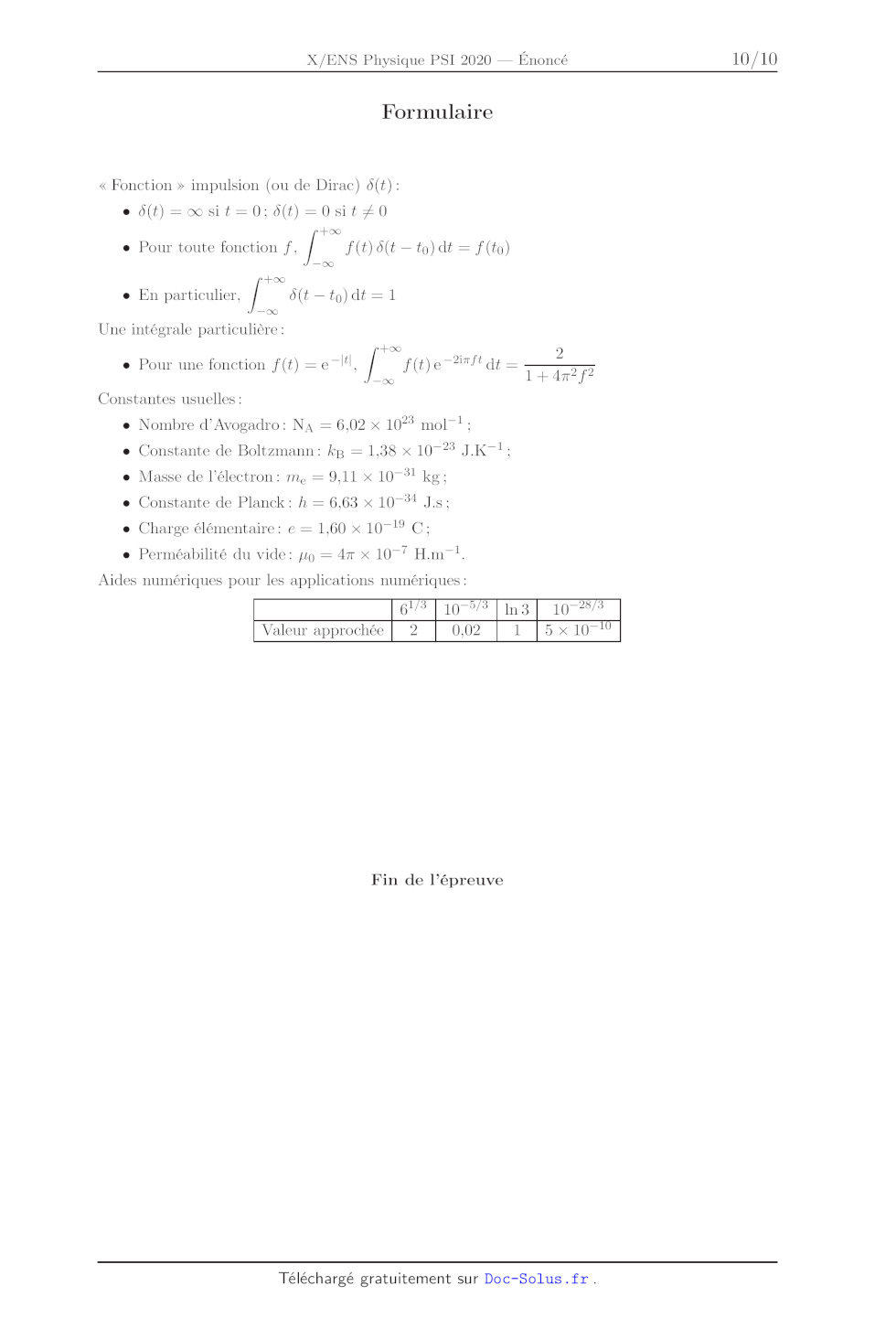 48. Sachant que 7 < 10 ns, la condition f < f. est-elle en général vérifiée en TP? On supposera cette condition vérifiée par la suite. III.2 Bruit dans une résistance On considère le même gaz d'électrons bidimensionnel de densité surfacique N,, étudié dans -- la partie IT, soumis aux forces f et f, ainsi qu'à l'action du champ électrique E -- E EUR. En moyenne, la conductivité surfacique de ce gaz est N.e?To Os m* 49. En déduire l'expression de la résistance Ro = U/L. On peut montrer que la différence de potentiel V(t) se met sous la forme N Re À 0 VO = DV = LS uit i=1l i=1l où v,; est la vitesse de l'électron 2 et N le nombre total d'électrons contenus dans le gaz. 50. Exprimer la densité spectrale de la quantité V;(t), notée Svy,(f) en fonction de la densité spectrale de la vitesse S,(f) trouvée précédemment. 51. On admet que Sy(f) = NSv,(f). Déduire de cette relation et de la question précédente, la relation de Johnson Nyquist Sy(f) = 2kpT Ro Commenter l'intérêt de travailler à des basses températures lors de mesures de précision. 52. La tension efficace du bruit est donnée par Up = V/Sv(f) Af avec À f la bande passante associée au diagramme de Bode précédent. Pour 7 = 10 ns, estimer la valeur numérique de Uk, pour une résistance de 300 (2 à température ambiante. Commenter. X/ENS Physique PSI 2020 -- Énoncé Formulaire « Fonction » impulsion (ou de Dirac) ô(t): e Ü(t)=osit=0;0(t) =0sit 0 +00 e Pour toute fonction f, | f(t) Ô(t -- to) dt = f(to) +00 e En particulier, | Ô(t--to)dt =1 OO Une intégrale particulière : Constantes usuelles : Aides numériques pour les applications numériques : +00 2 e Pour une fonction f(t) =e-lil, |. ft) er dt -- 1+472f2 e Nombre d'Avogadro: Na = 6,02 x 10% mol !: Constante de Boltzmann: kp = 1,38 x 10% J.K-!{: Masse de l'électron : ma = 9,11 x 10--°1 Kg ; Constante de Planck: k = 6.63 x 107% J.s: Charge élémentaire: e = 1,60 x 107 !° C: Perméabilité du vide: 0 = 4m x 1077 Him !. 61/3 |10-% | In3 | 107-285 Valeur approchée | 2 0,02 1 15x10 10 Fin de l'épreuve