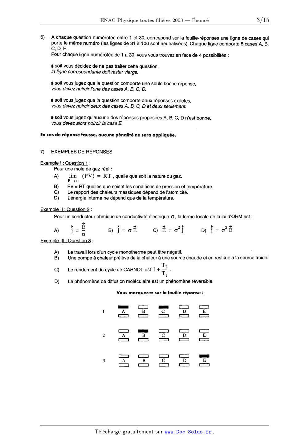 >< X >< " X X " xxxxxxxxxxxxxxxx 6 8 L 9 9 V 8 Z |- 0 'Il" """/I AXE AXE AXE 2) Pour remplir ce QCM, vous devez utiliser un STYLO BILLE ou une POINTE FEUTHE de couleur NOIRE. 3) Utilisez le sujet comme brouillon et ne retranscrivez vos réponses qu'après vous être relu soigneuse- ment. 4) Votre OCM ne doit pas être souillé, froissé, plié, écorné ou porter des inscriptions superflues, sous peine d'être rejeté par la machine et de ne pas être corrigé. 5) Cette épreuve comporte 30 questions, certaines, de numéros consécutifs, sont liées. La liste des ques- tions est donnée au début du texte du sujet. Chaque candidat devra choisir au plus 25 questions parmi les 30 proposées. Il est inutile de répondre à plus de 25 questions : la machine à lecture optique lira les réponses en séquence en partant de la ligne 1, et s'arrêtera de lire lorsqu'elle aura détecté des réponses à 25 ques- tions, quelle que soit la valeur de ces réponses. Chaque question comporte au plus deux réponses exactes. 6) A chaque question numérotée entre 1 et 30, correspond sur la feuille-réponses une ligne de cases qui porte le même numéro (les lignes de 31 à 100 sont neutralisées). Chaque ligne comporte 5 cases A, B, C, D, E. Pour chaque ligne numérotée de 1 à 30, vous vous trouvez en face de 4 possibilités : » soit vous décidez de ne pas traiter cette question, la ligne correspondante doit rester vierge. ) soit vous jugez que la question comporte une seule bonne réponse, vous devez noircir l'une des cases A, B, C, D. 0 soit vous jugez que la question comporte deux réponses exactes, vous devez noircir deux des cases A, B, C, D et deux seulement. » soit vous jugez qu'aucune des réponses proposées A, B, C, D n'est bonne, vous devez alors noircir la case E. En cas de réponse fausse, aucune pénalité ne sera appliquée. 7) EXEMPLES DE REPONSES Exemple | :Question 1 : Pour une mole de gaz réel : A) lim (PV) : RT , quelle que soit la nature du gaz. P-->o